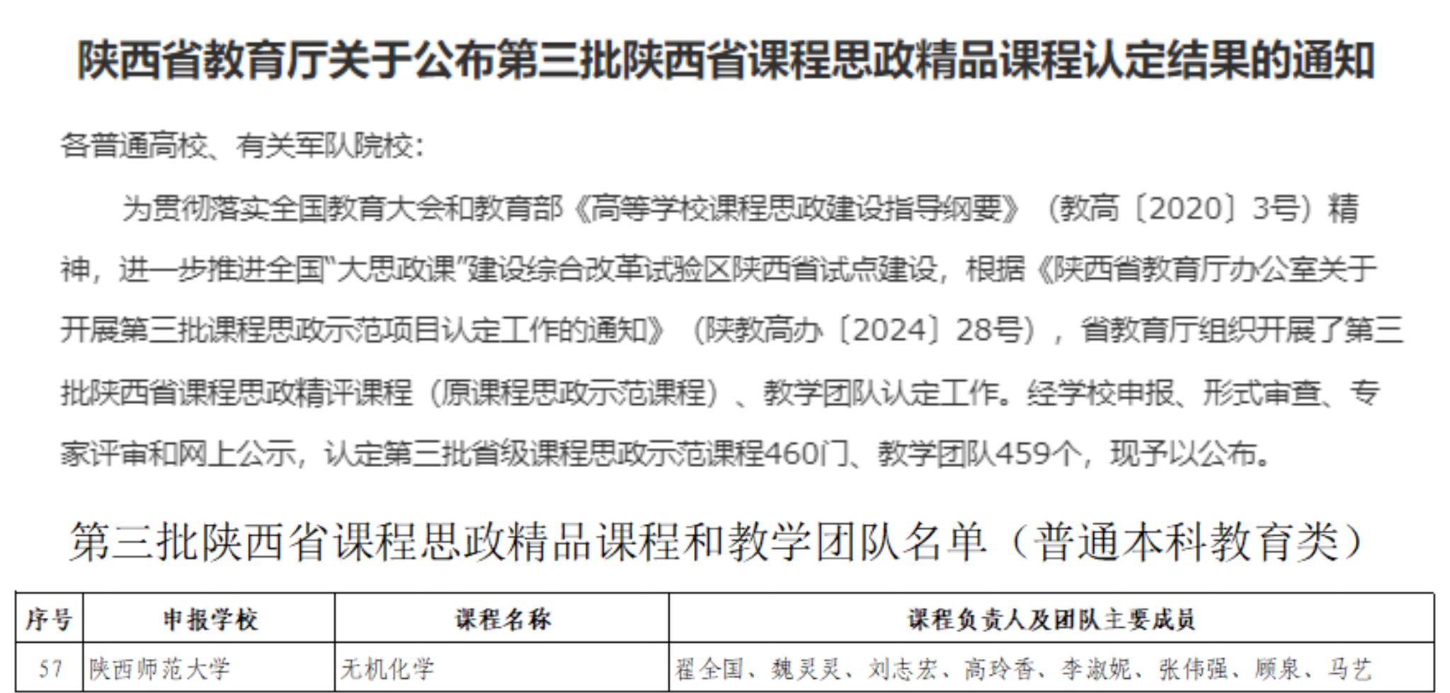 近日,陕西省教育厅发布了《陕西省教育厅关于公布第三批陕西省课程思政精品课程认定结果的通知》,公司翟全国教授主持的《无机化学》课程成功入选,该课程教学团队同时被认定为陕西省课程思政教学团队。