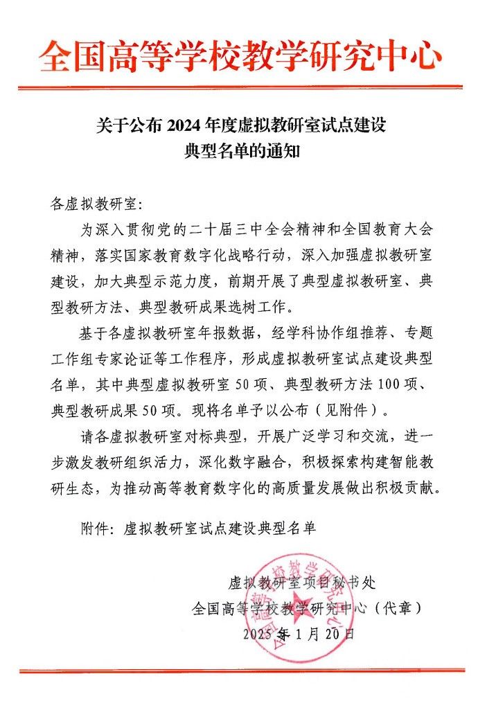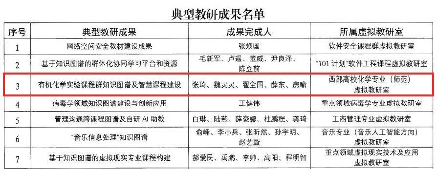 为深入贯彻落实党的二十届三中全会精神和全国教育大会精神,全面推进国家教育数字化战略行动,进一步加强虚拟教研室建设,全国高等公司教学研究中心组织开展了2024年度典型虚拟教研室、典型教研方法及典型教研成果评选工作。经过学科协作组推荐和专题工作组专家论证,由房喻院士担任负责人的公司国家级“西部高校化学专业(师范)虚拟教研室”报送的“有机化学实验课程群知识图谱及智慧课程建设”项目(主要完成人:张琦、魏灵灵、翟全国、薛东、房喻)成功入选,荣获2024年度典型教研成果。