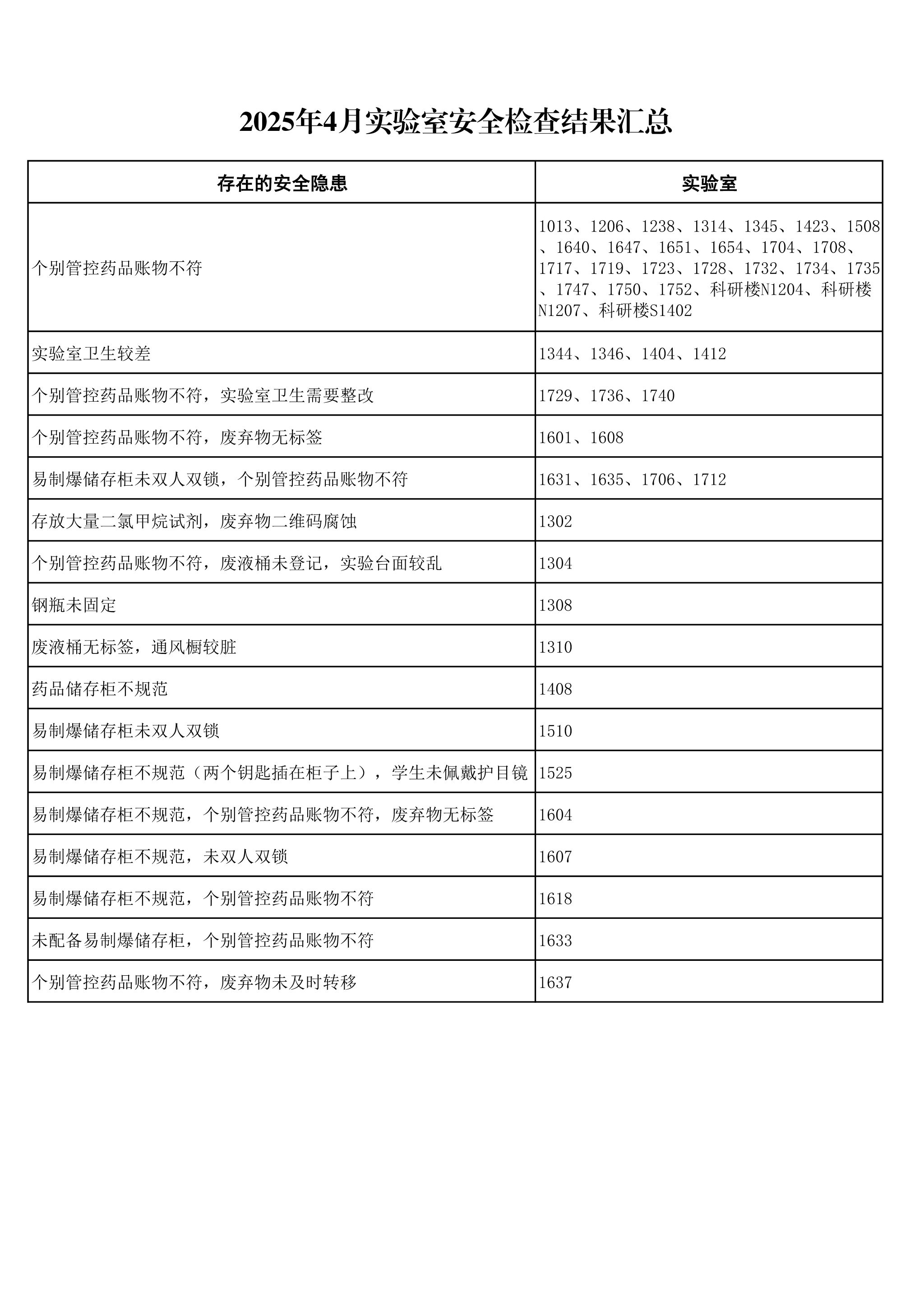 经检查发现,本次安全检查整体情况较好,但仍存在一些安全隐患,主要包括个别管控药品账物不符、实验室卫生较差、易制爆储存柜使用、管理不规范等。
