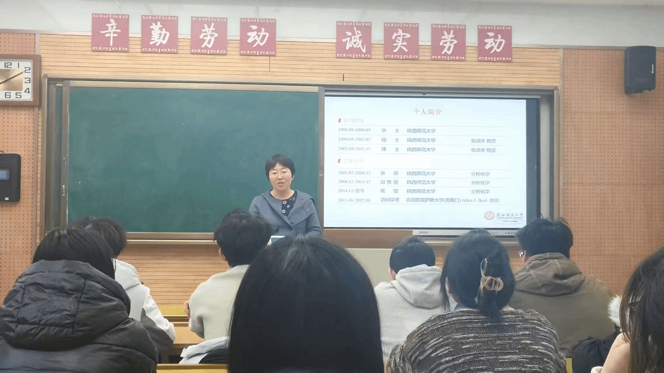 3月19日,化学2402班在雁塔校区教学五楼5205教室举办“教授接待日”活动,漆红兰教授应邀参加。漆老师分享了自己的求学和工作经历,讲述了自己在电化学和电化学发光生物传感分析方面的研究心得。嘱咐同学们:一要保持批判性思维,全面客观地洞察世界;二要树立明确目标,坚定不移地付诸行动;三要培养热爱态度,满怀激情地投入知识与工作;四要秉持探索精神,凭借智慧去推动科学进步。