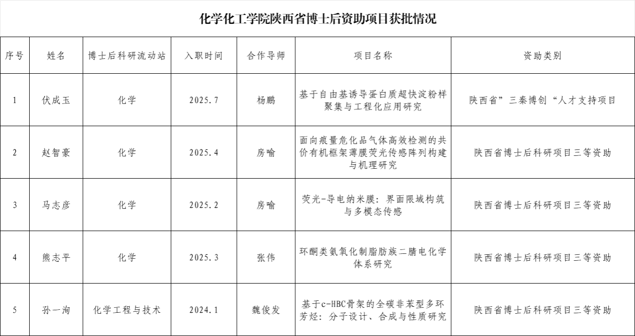 据悉,公司化学博士后科研流动站赵智豪、马志彦、熊志平博士后,化学工程与技术科研流动站孙一洵博士后的项目也获得陕西省博士后科研项目三等资助。