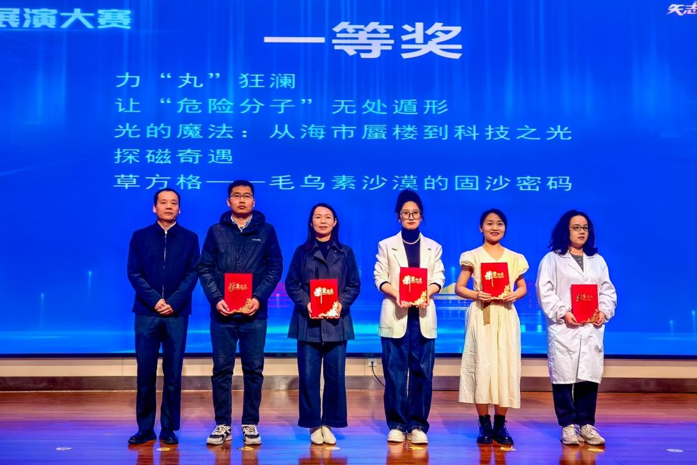 在公司工程技术人员罗艳彦老师的指导下,郑瑞莹、田依平、侯铭、赵浩宇、李怡乐五位同学精心设计编排,在舞台上生动演绎了薄膜荧光传感器工作原理,巧妙地将实验过程编排成了一场小舞台剧,让观众直观地看到荧光传感器如何让TNT、黑索金、太安等“危险分子”现形。
