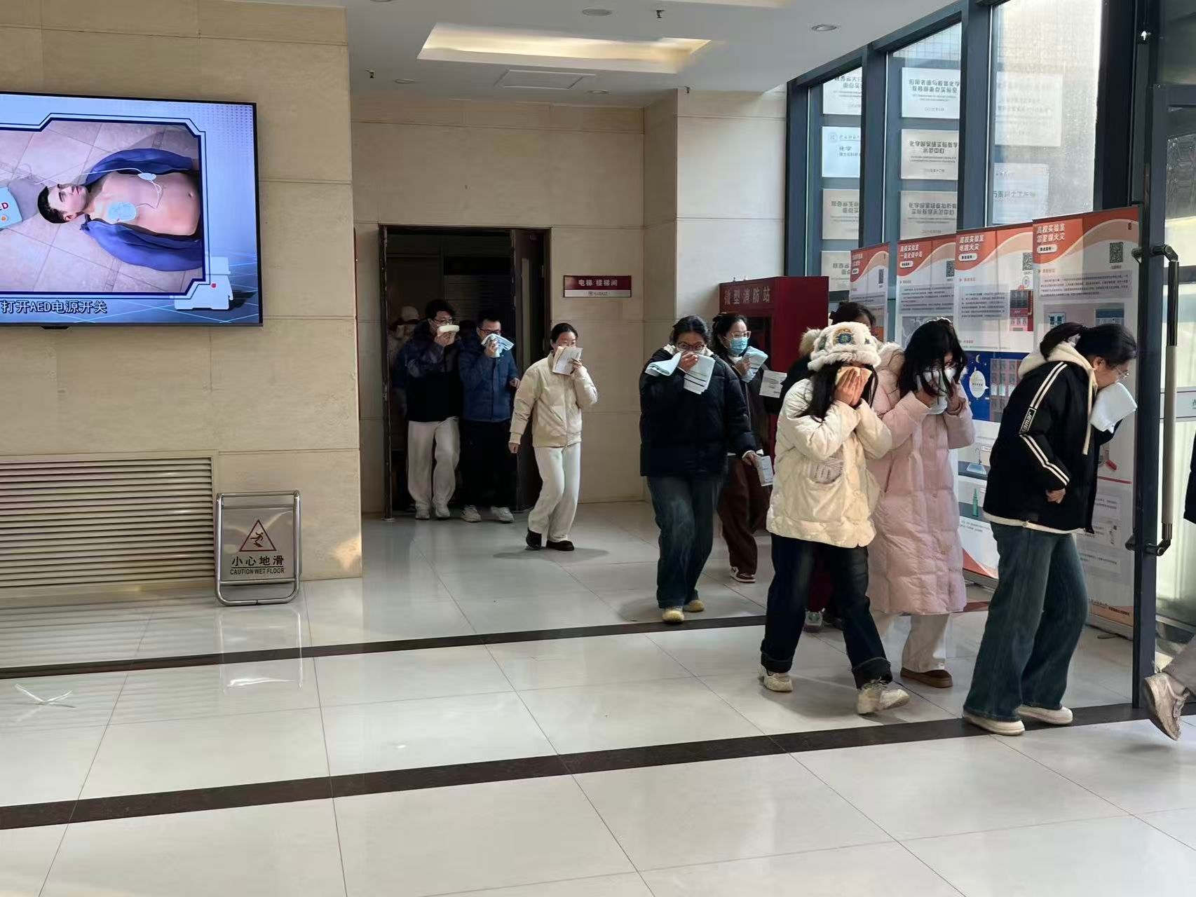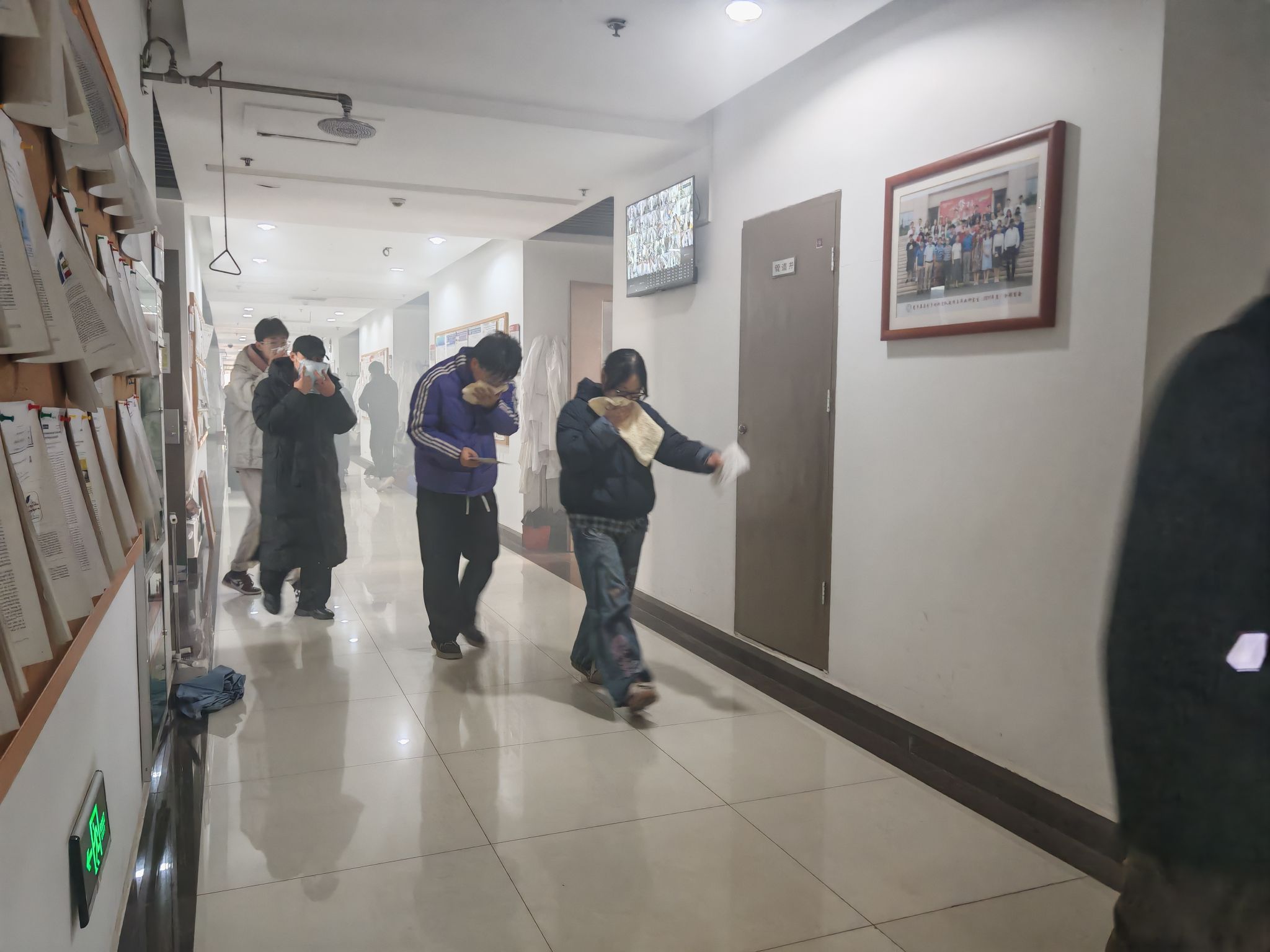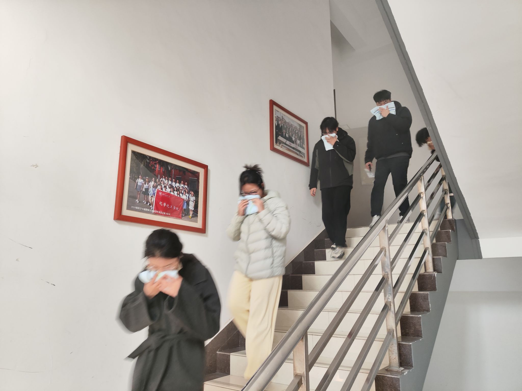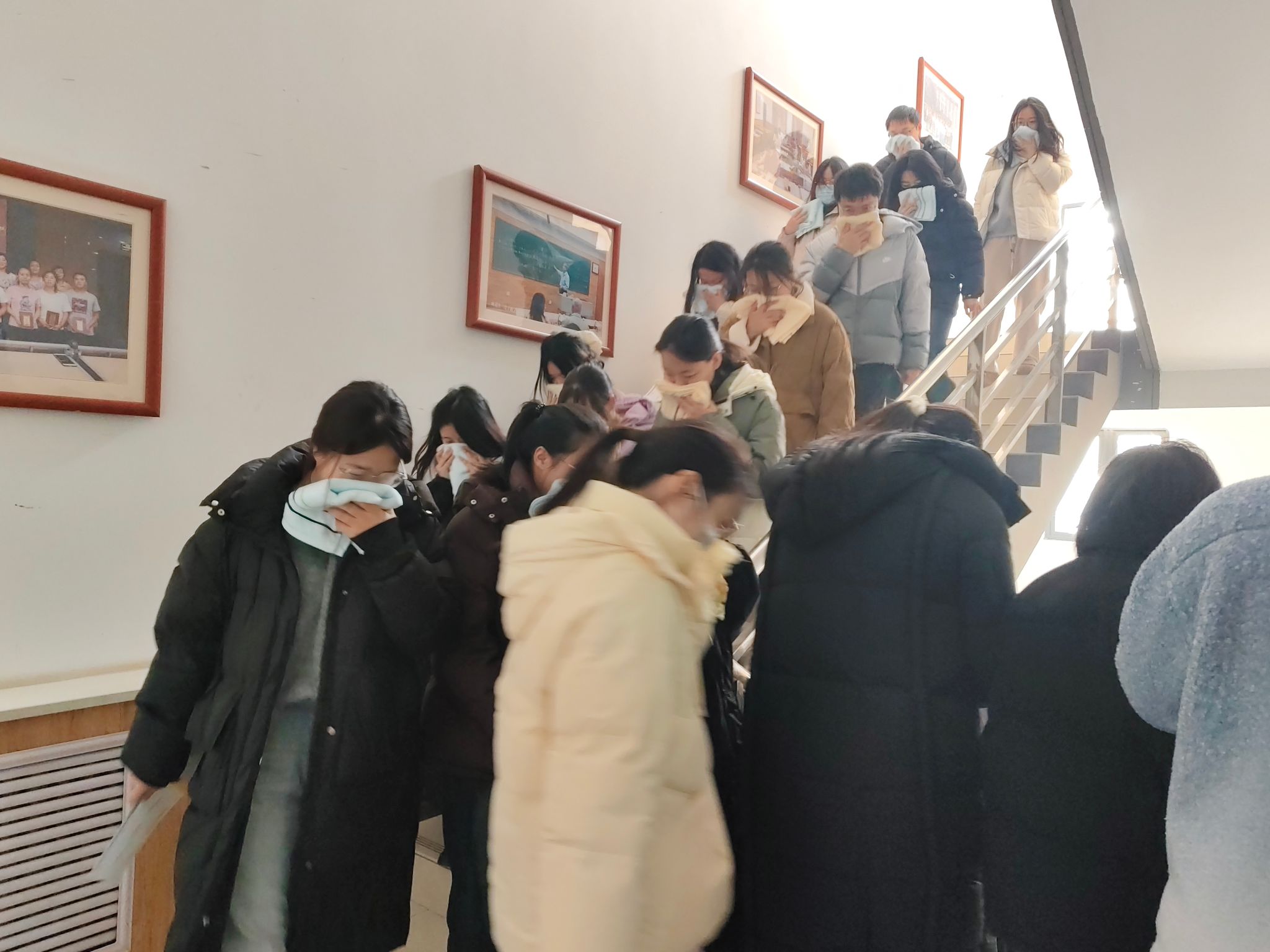 本次活动分阶段有序推进。上午7:00,工作人员在致知楼南门通过二维码精准统计入场人员,同步发放消防安全物资,为演练顺利开展奠定基础。9:30,总指挥肖新军发布应急疏散指令,各楼层迅速启动烟雾发生器并拉响警报,应急疏散环节全面展开,引导师生员工采取“打湿毛巾、捂住口鼻、弯腰靠右、有序下楼”的科学逃生方式撤离。整个疏散过程高效有序,仅用时4分53秒,共安全疏散人员818名。