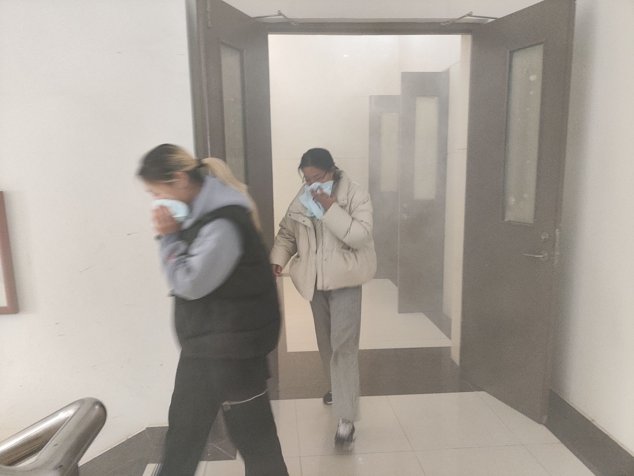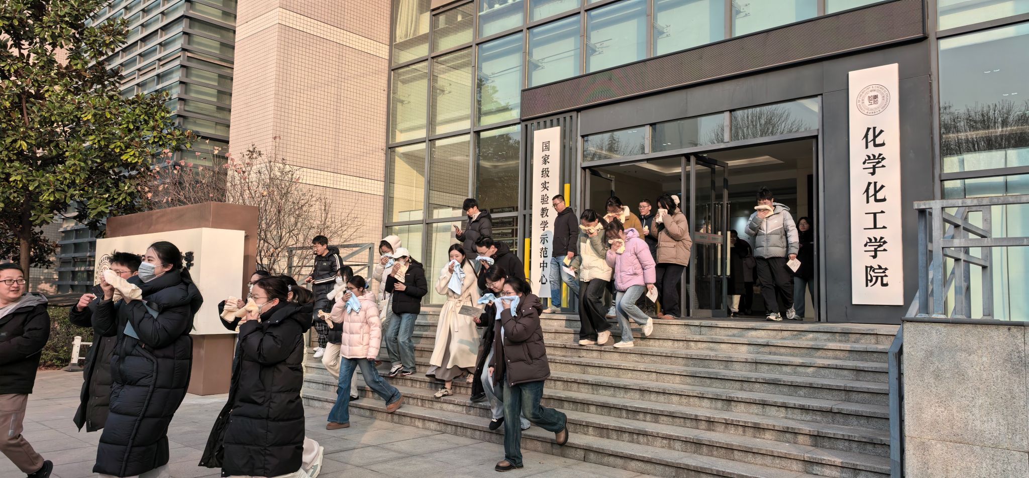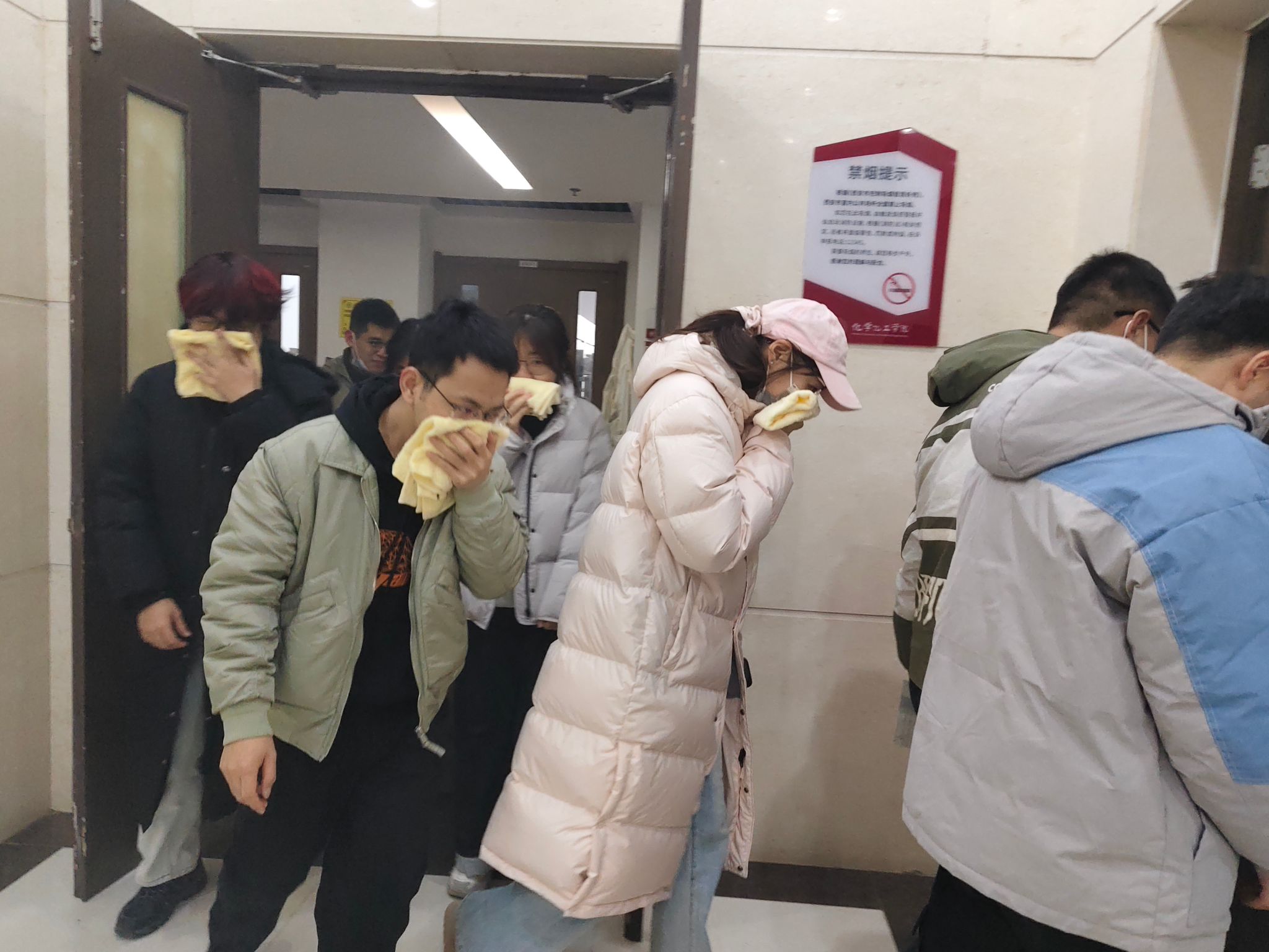 本次活动分阶段有序推进。上午7:00,工作人员在致知楼南门通过二维码精准统计入场人员,同步发放消防安全物资,为演练顺利开展奠定基础。9:30,总指挥肖新军发布应急疏散指令,各楼层迅速启动烟雾发生器并拉响警报,应急疏散环节全面展开,引导师生员工采取“打湿毛巾、捂住口鼻、弯腰靠右、有序下楼”的科学逃生方式撤离。整个疏散过程高效有序,仅用时4分53秒,共安全疏散人员818名。