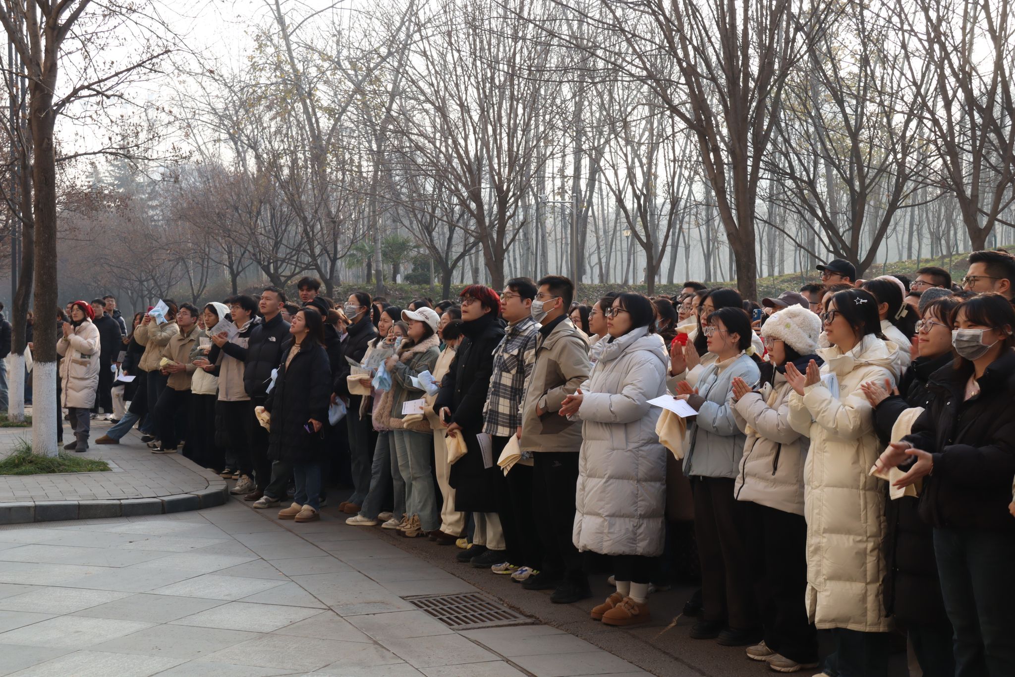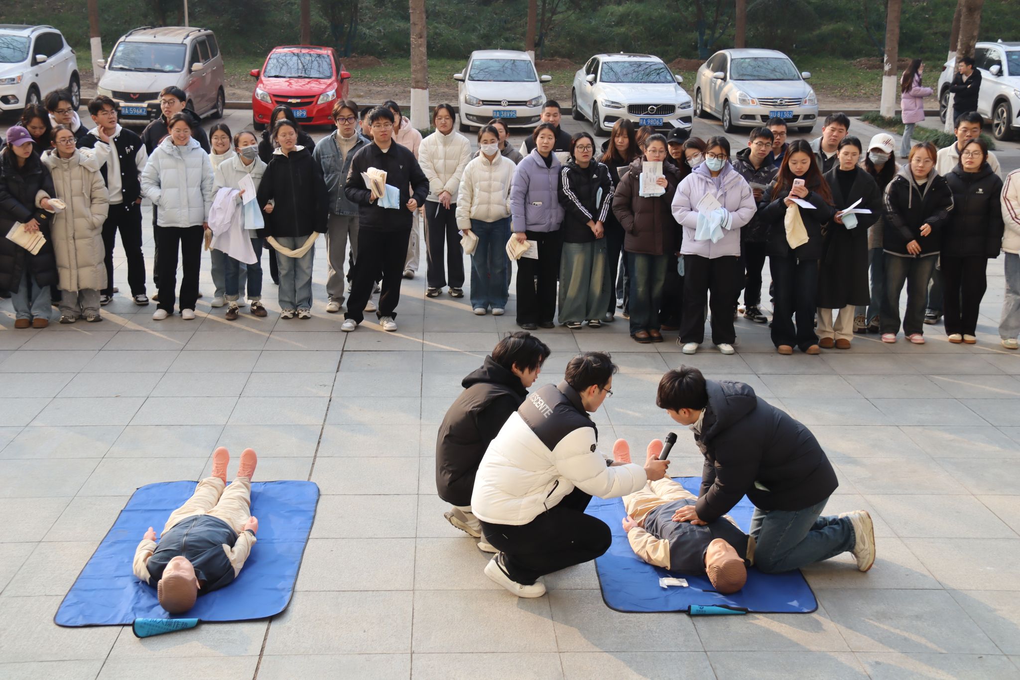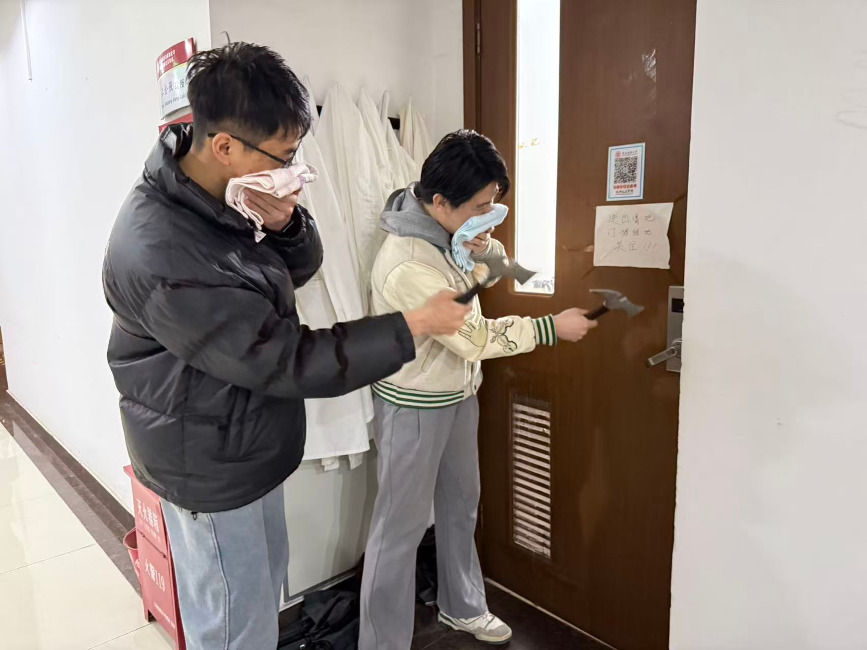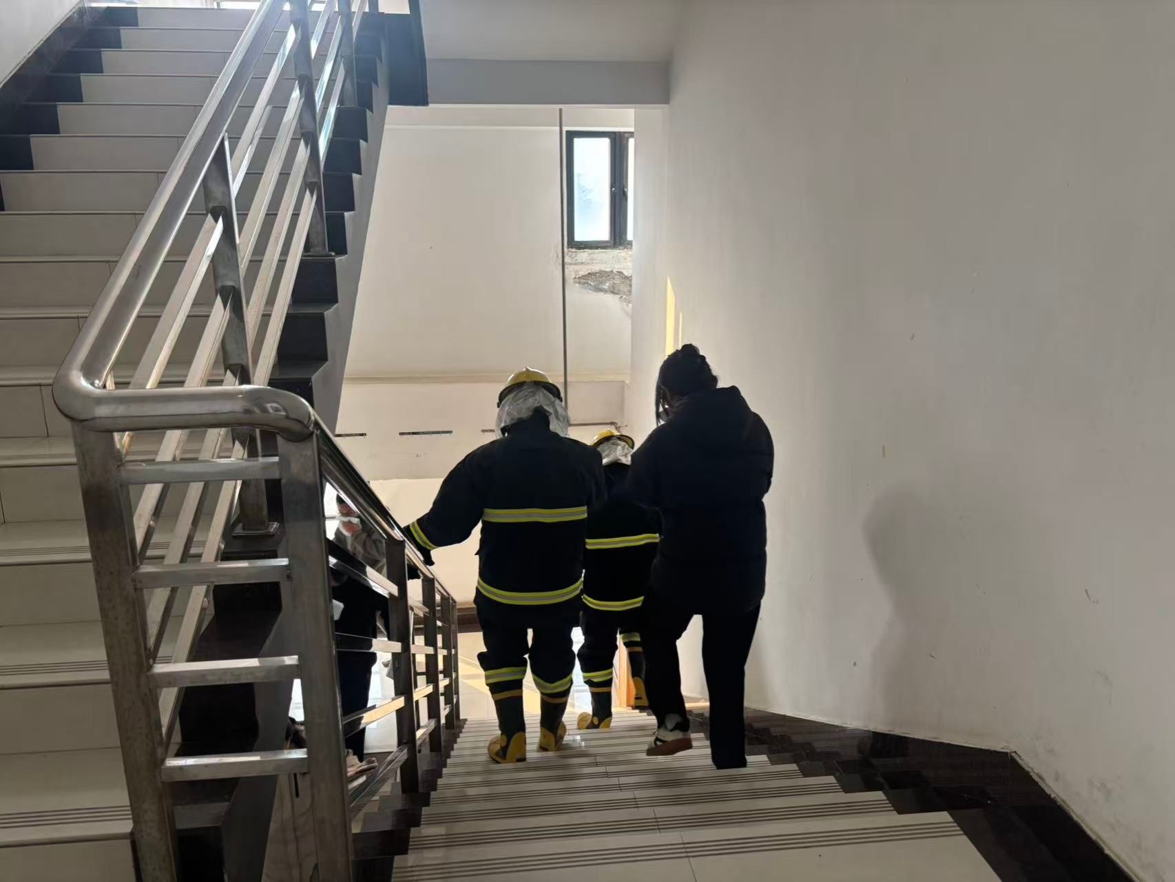 本次活动分阶段有序推进。上午7:00,工作人员在致知楼南门通过二维码精准统计入场人员,同步发放消防安全物资,为演练顺利开展奠定基础。9:30,总指挥肖新军发布应急疏散指令,各楼层迅速启动烟雾发生器并拉响警报,应急疏散环节全面展开,引导师生员工采取“打湿毛巾、捂住口鼻、弯腰靠右、有序下楼”的科学逃生方式撤离。整个疏散过程高效有序,仅用时4分53秒,共安全疏散人员818名。