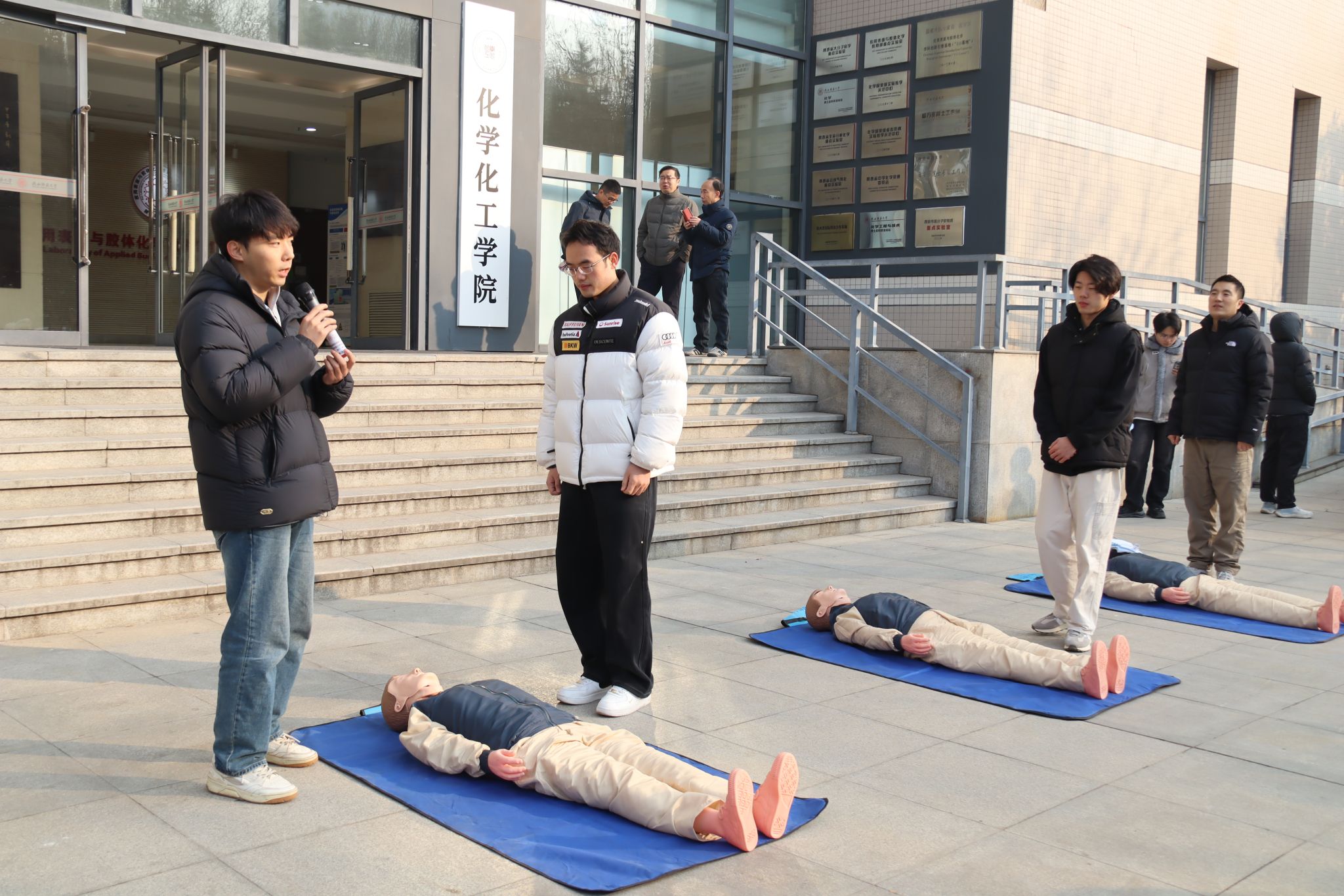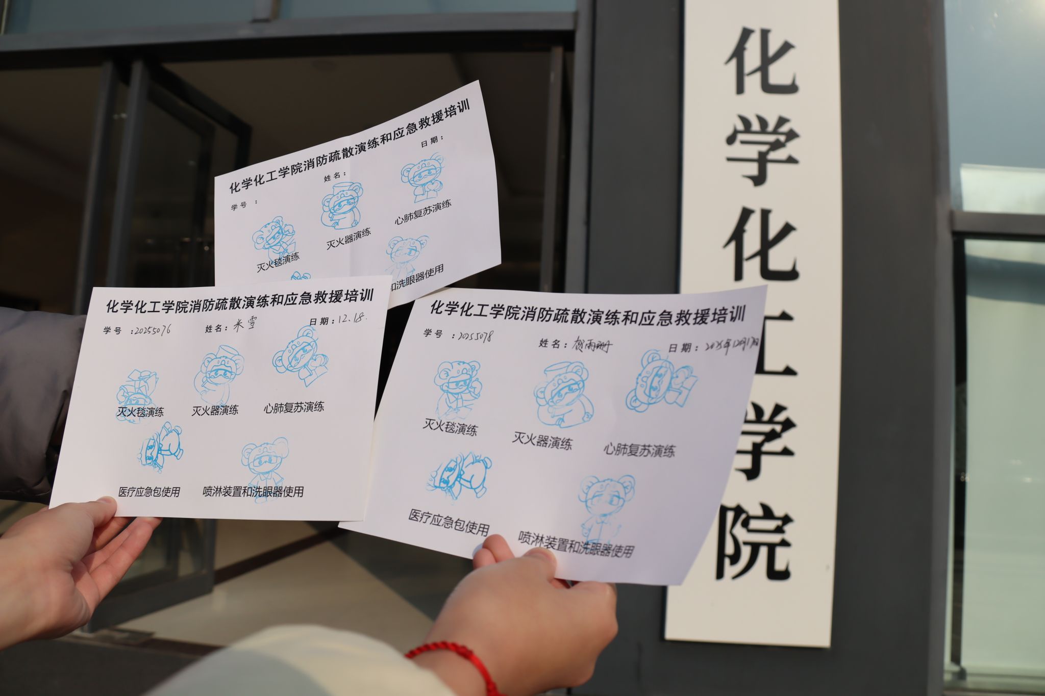 第二阶段专项应急救助培训面向全院研究生及教职工分组开展,涵盖三大板块内容:一是灭火项目培训,包括灭火毯、灭火器实操演练;二是医学紧急救助培训,涵盖心肺复苏和医疗应急包使用;三是喷淋装置和洗眼器使用培训。培训中,校医院外科大夫李米红针对实验与火灾场景中的常见外伤,详细讲解了关键急救步骤,并现场演示了医疗应急包内物品的规范使用方法;体育公司研究生王一凡按照 “判断患者反应、纠正患者体位、判断脉搏、胸外按压、开放气道、人工呼吸”6 个步骤,现场示范心肺复苏关键急救技术;实验中心相关老师详细演示灭火器、灭火毯等消防器材使用方法及注意事项;各楼层负责老师全程指导监督喷淋和洗眼器装置使用,确保参训人员逐一完成理论学习与实践操作。为提升培训互动性与参与度,本次培训创新采用 “beats365唯一官方网站消防疏散演练和应急救援培训卡” 集章打卡模式,参与者每完成一项培训内容,工作人员即在卡片对应位置加盖公司 IP 形象 “化小星” 专属印章,有效激发了员工参与热情。
