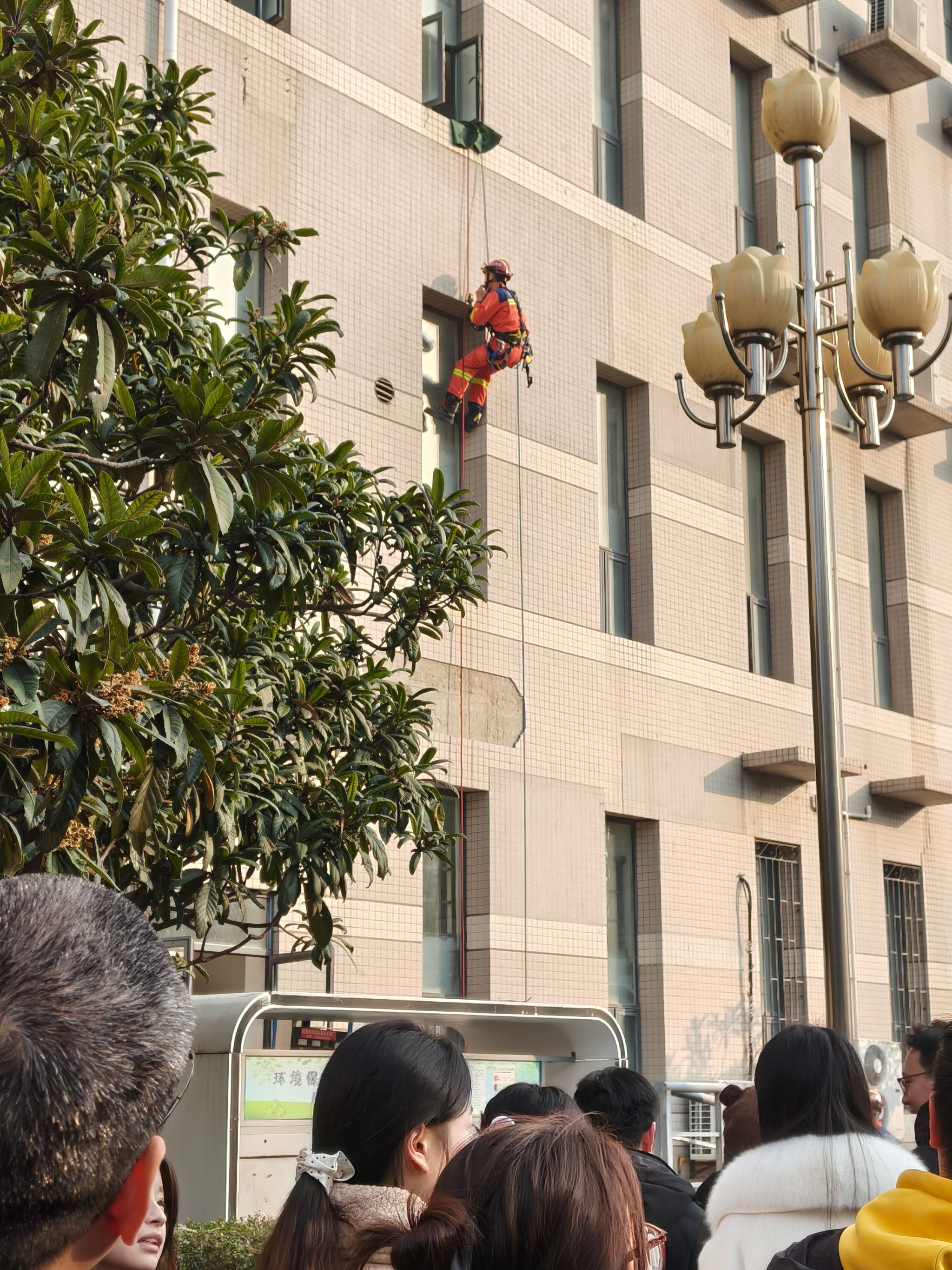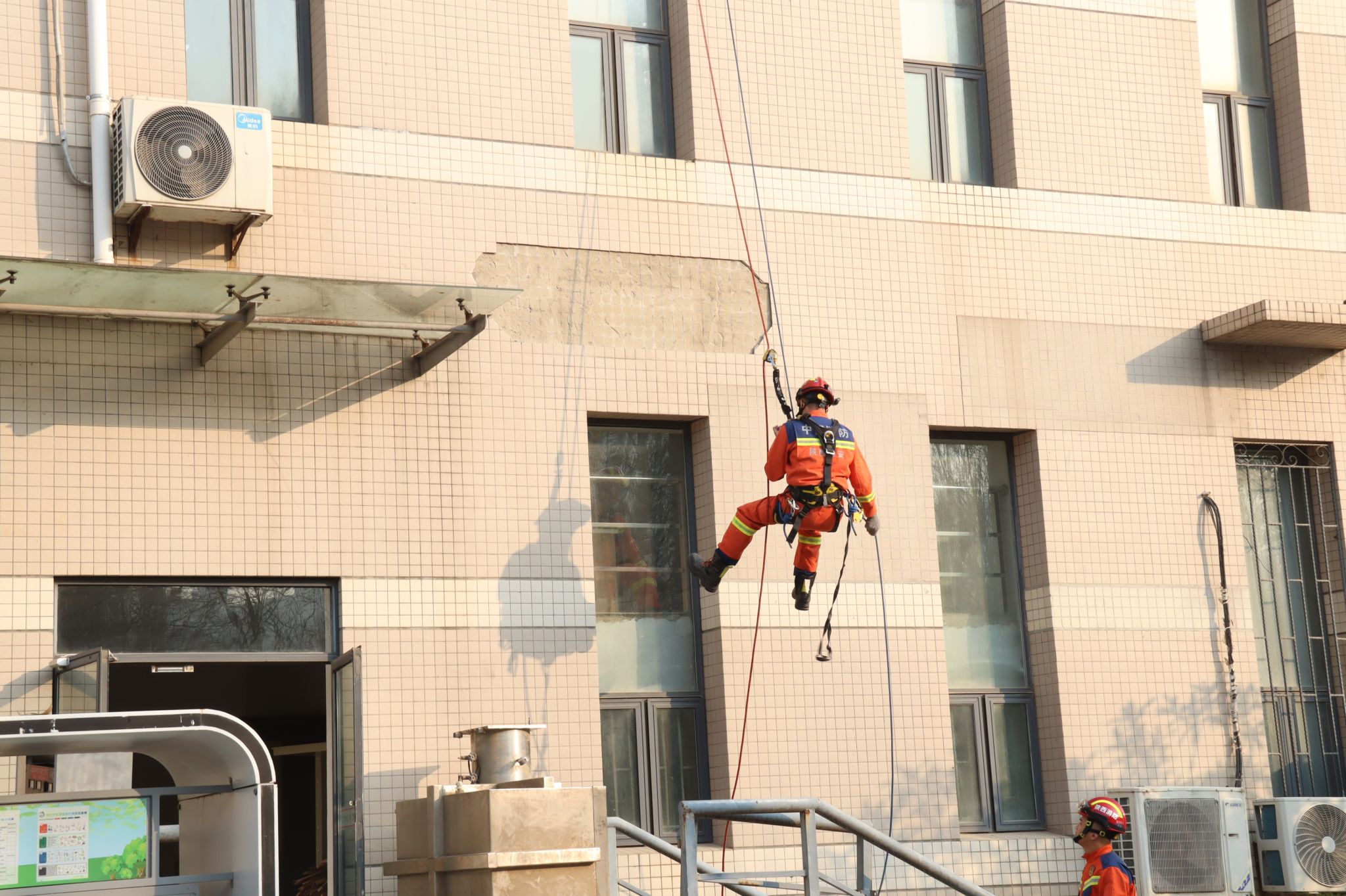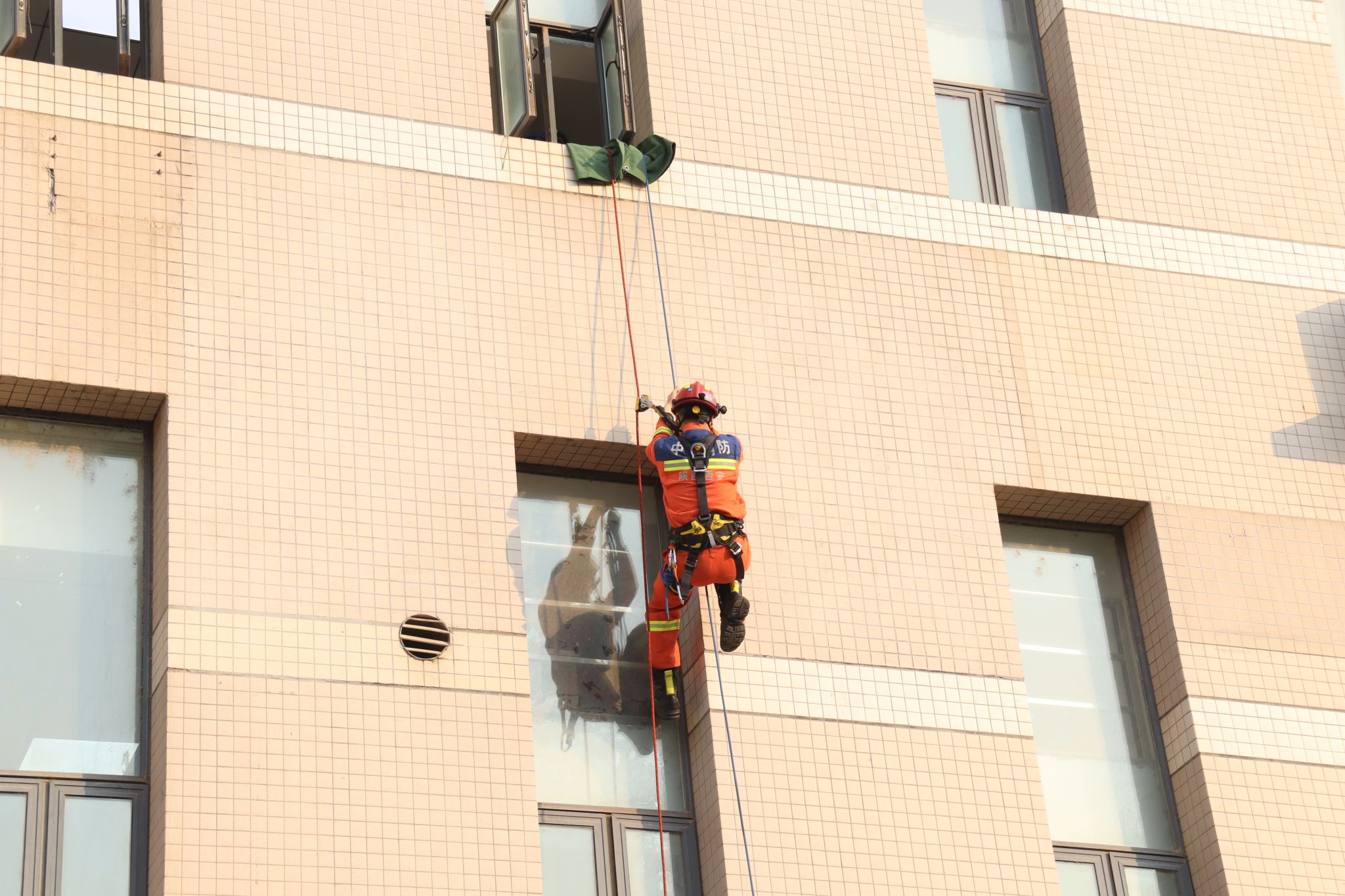 针对高层建筑火灾逃生这一重点环节,公司特别邀请长安区消防大队翰林南路消防救援站队员现场教学高空速降逃生技能。队员王杰详细讲解速降动作技术要领、安全绳锁使用方法及适用场景,示范员陈俊进行现场展示,为师生传授了专业实用的逃生知识,助力师生掌握保障生命安全的关键技能。