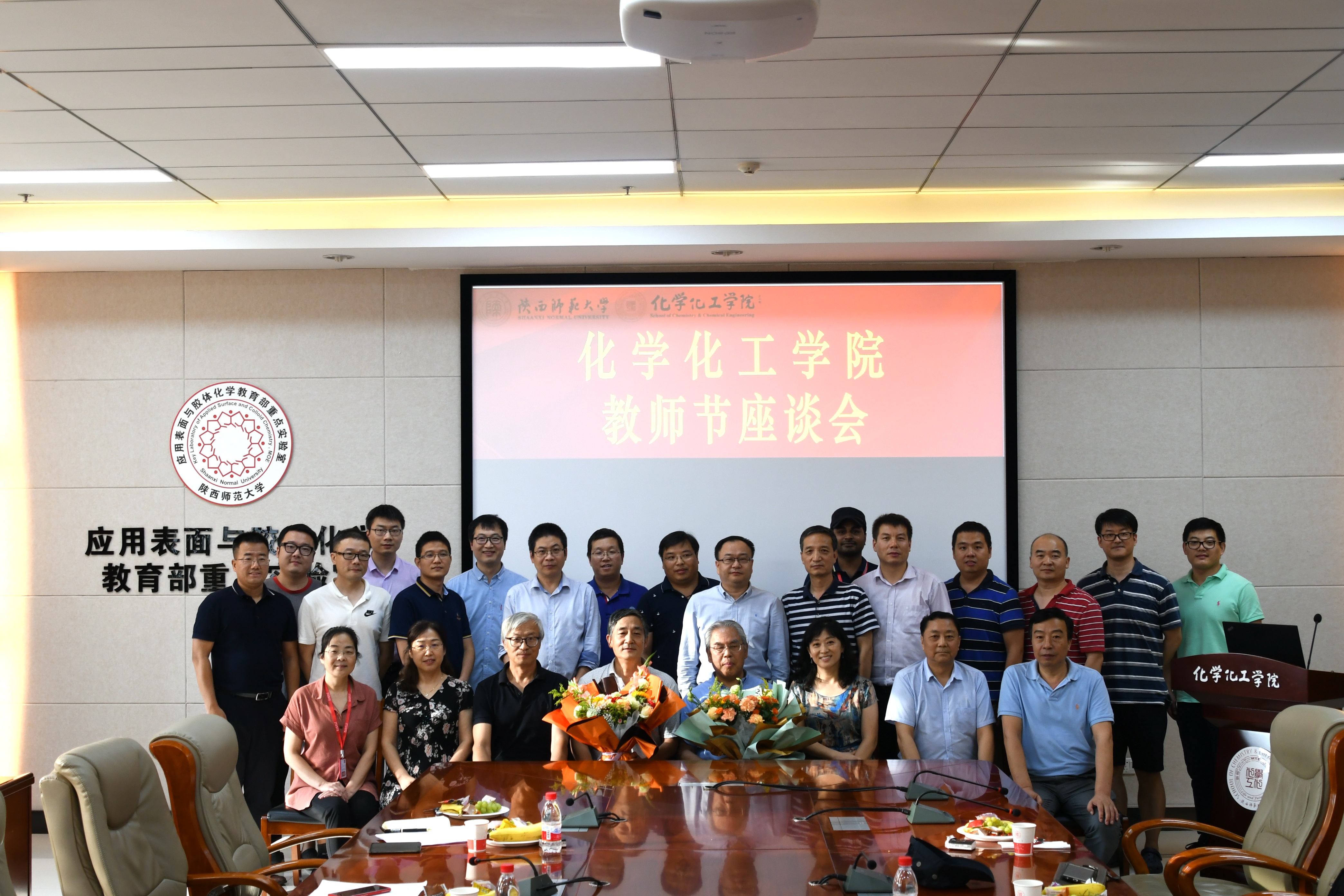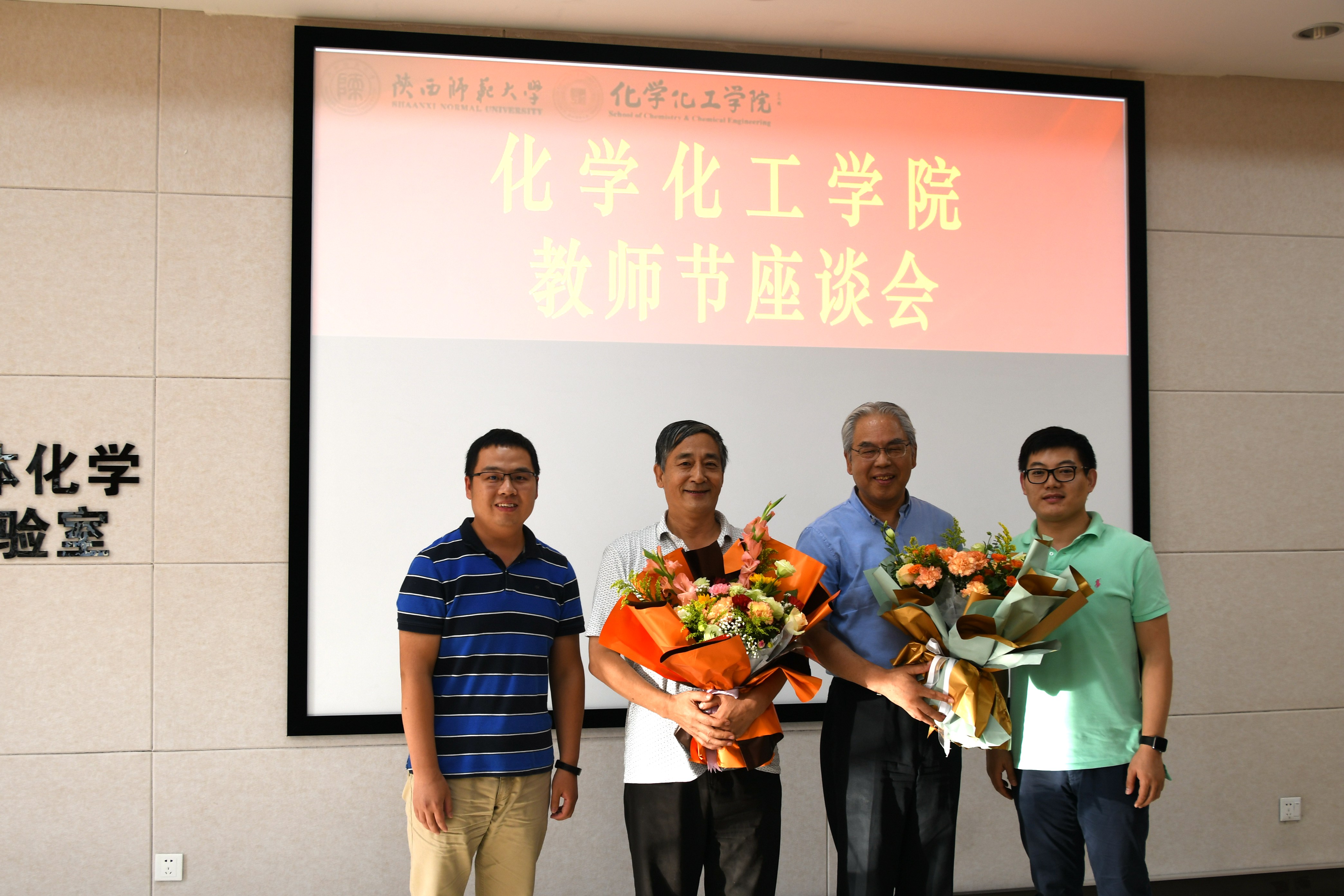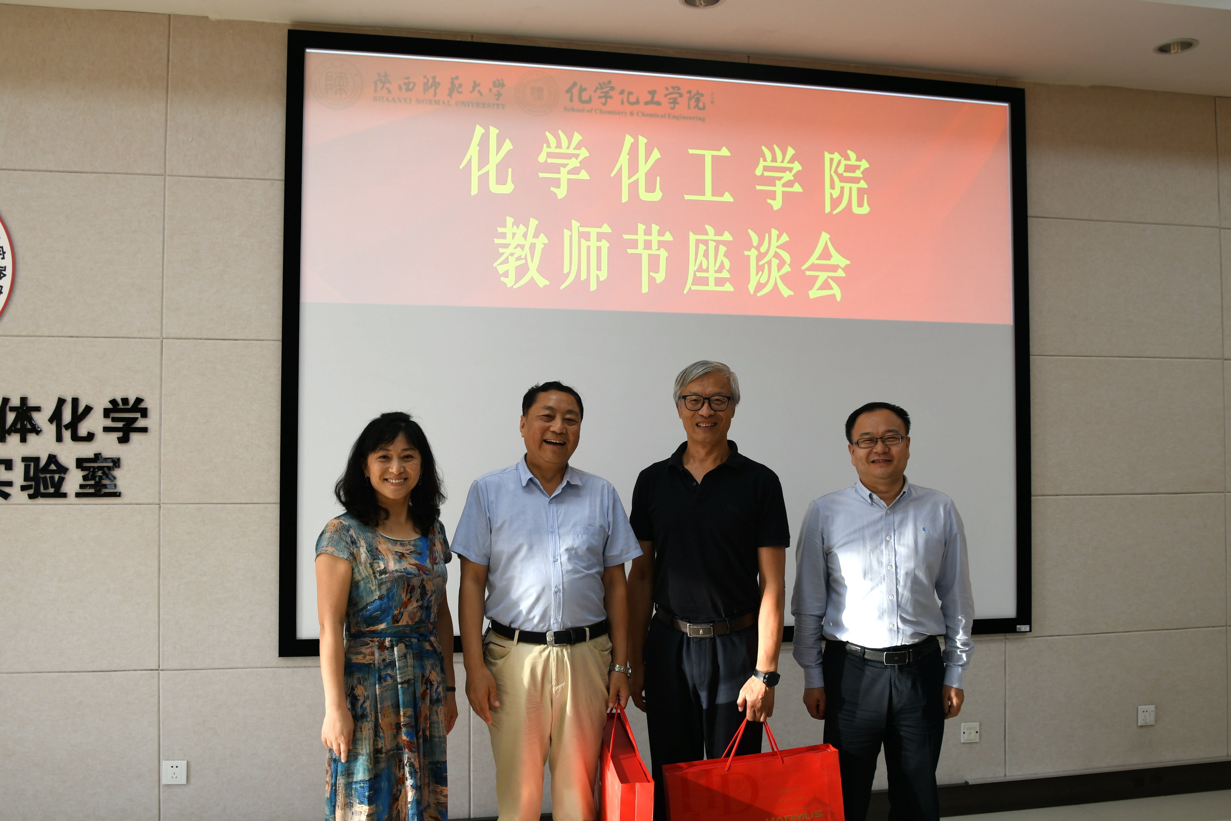 座谈会后,高玲香、薛东向荣休教师陈战国、周宝石赠送了礼品,青年教师代表朱晓林、刘忠山为在师大从教43年的房喻教授、张成孝教授献上了承载全院师生厚重情谊的鲜花并合影留念。“黑发积霜织日月,粉笔无言写春秋”,公司的发展壮大渗透了老同志们的汗水和心血。为退休教师送一份礼品,让年轻教师为老教师送一束鲜花,举动虽小,但传承的却是人民教师献身教育、甘为人梯的崇高境界,无私奉献、呕心育人的可贵品格,爱岗敬业、厚德载物的职业操守。