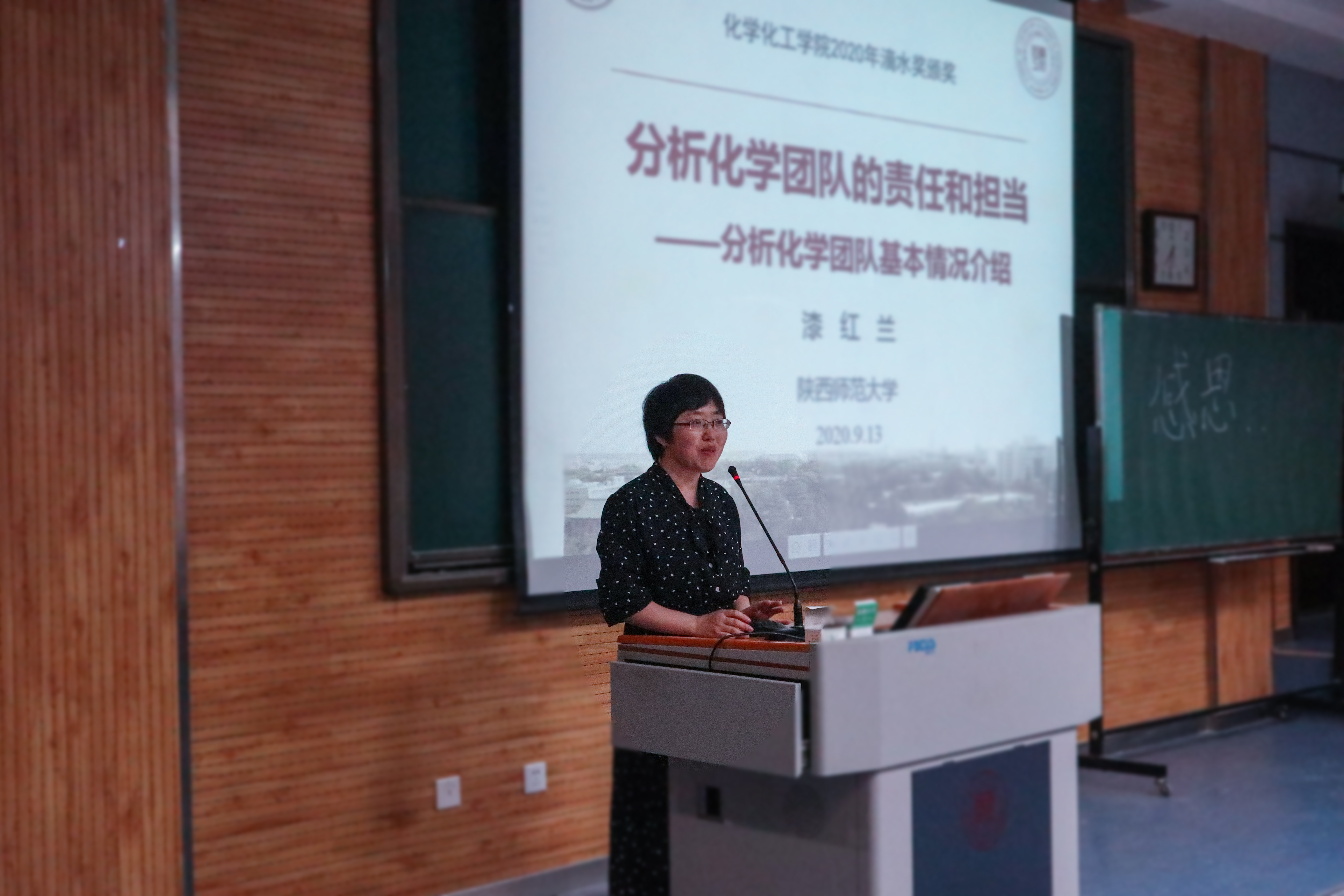 漆红兰老师以“分析化学团队的责任与担当”为题,从分析化学的学科背景、教学团队、科研团队及重点实验室四个方面,全面地介绍了分析化学团队的历史沿革和学科发展走向,并表示将坚定不移地传承老一辈教育者孜孜不倦、追求真理的工匠精神,努力践行为党育人、为国育才的初心使命。获奖员工代表白丽娟发表感言,她表达了对公司老师们的感谢,并呼吁同学们以求真务实、严谨科学的态度锤炼本领,将爱国之志化为报国之行,做追求卓越的新时代青年。