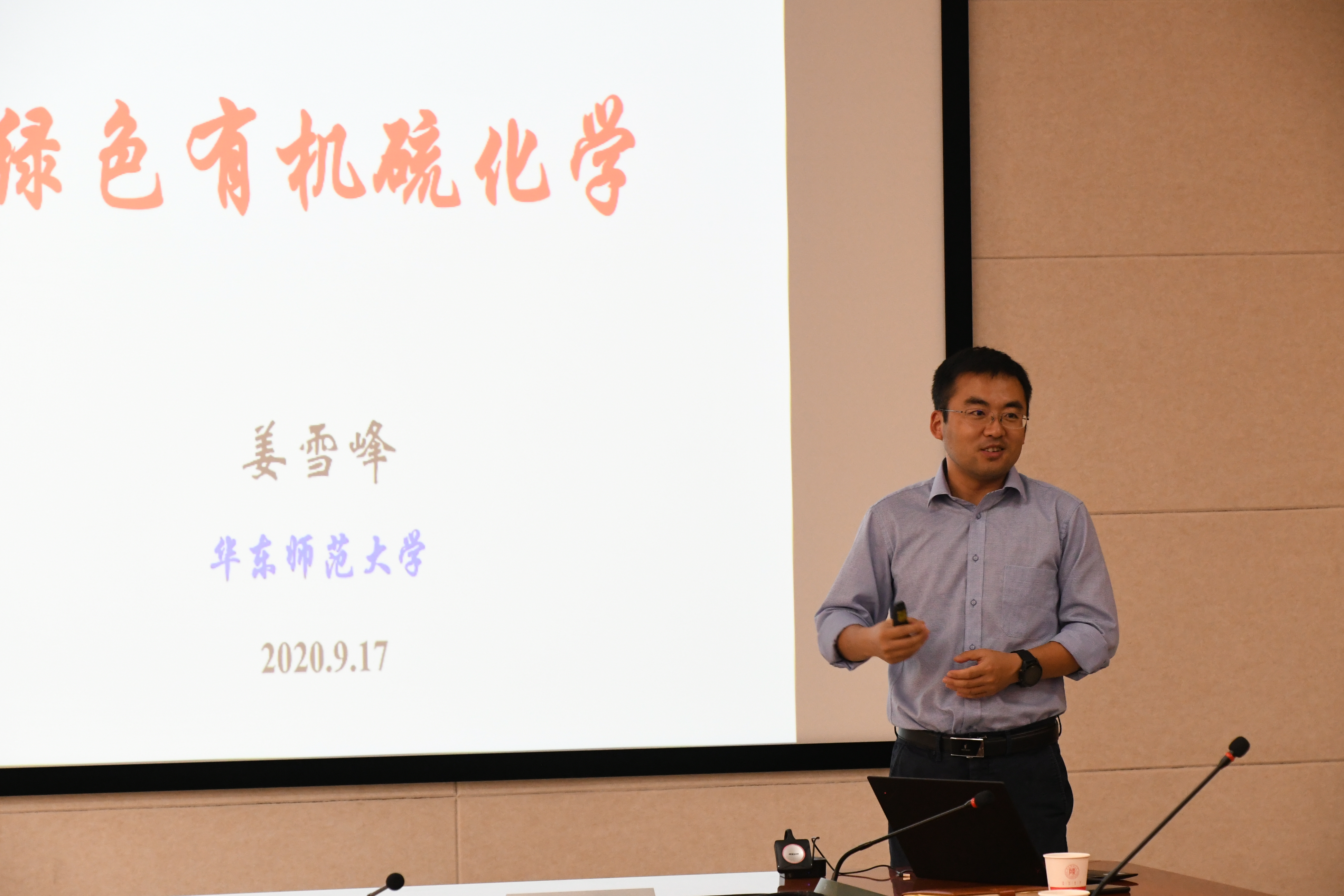 2020年9月17日,华东师范大学化学公司姜雪峰教授应邀来公司进行学术交流,并于公司长安校区致知楼1568报告厅为公司师生做了一场题为“绿色有机硫化学”的前沿讲座。公司翟全国教授、李超群教授、赵玉明教授、黄治炎副教授、杨明瑜副教授、戚自松副研究员、李刚博士、王丁博士等老师出席了报告会,相关研究生和本科生到场聆听了报告。会议由薛东教授主持。