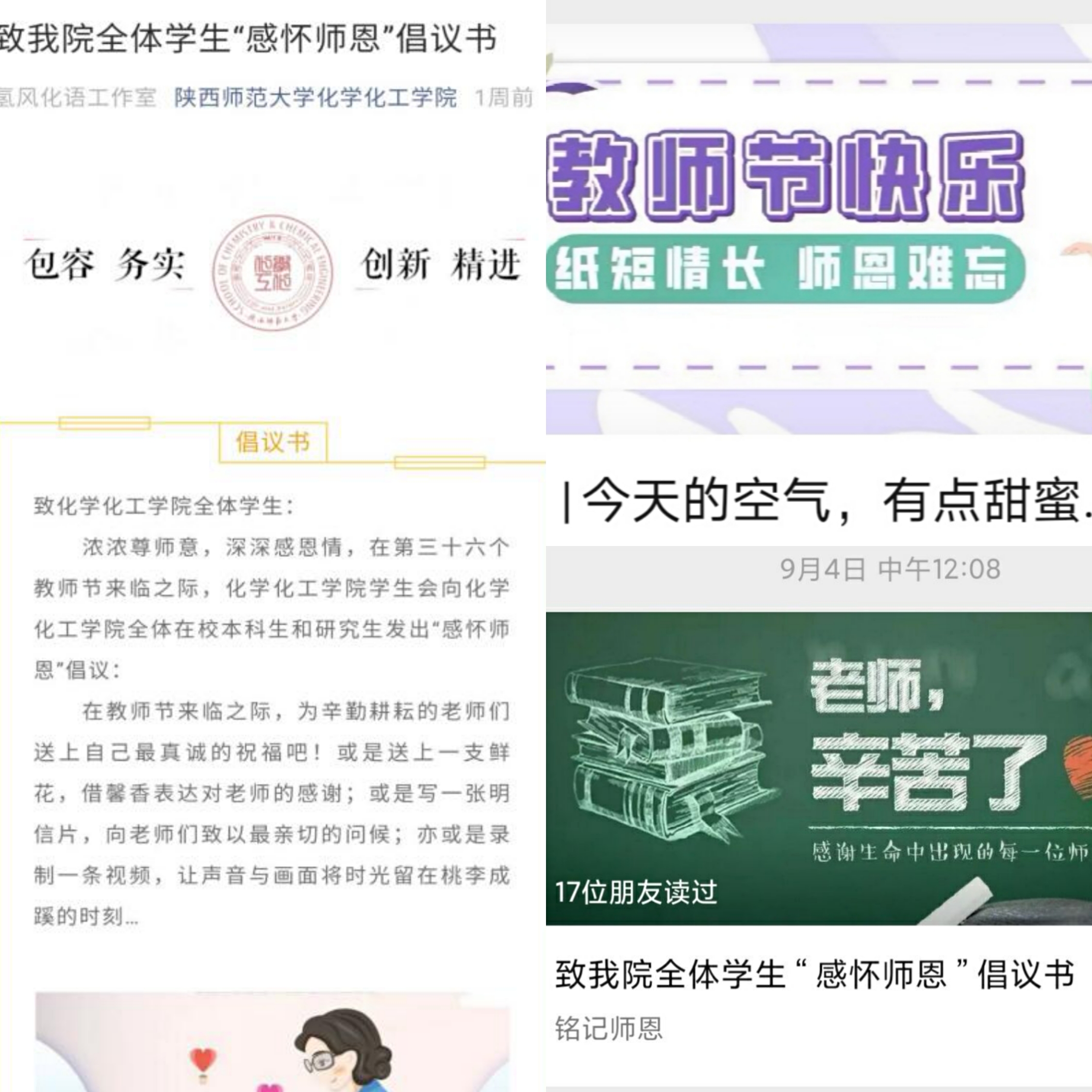 截止2020年9月10日下午,员工会收到来自研究生、本科生多个班级的文字、照片投稿,同学们对老师们的深情告白将教师节感恩活动推向高潮。
