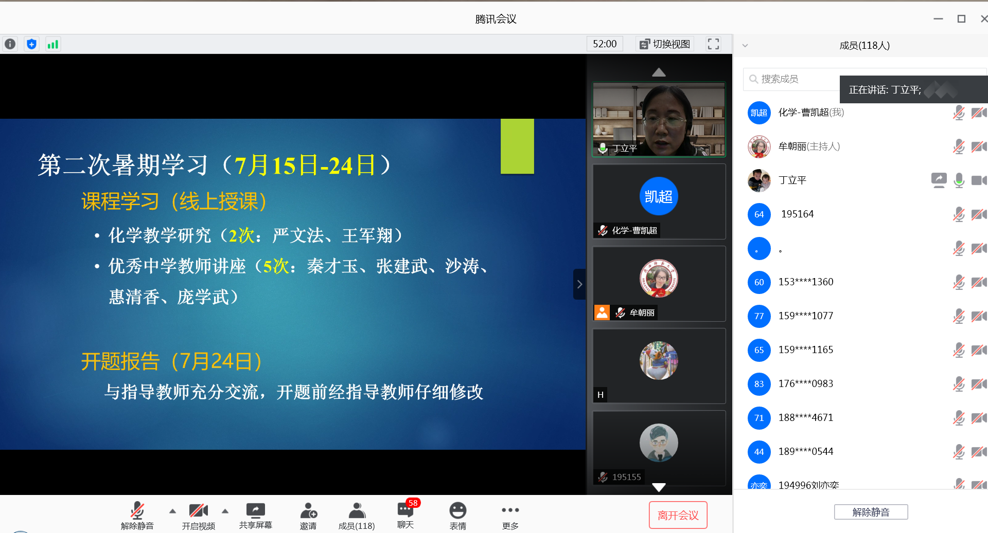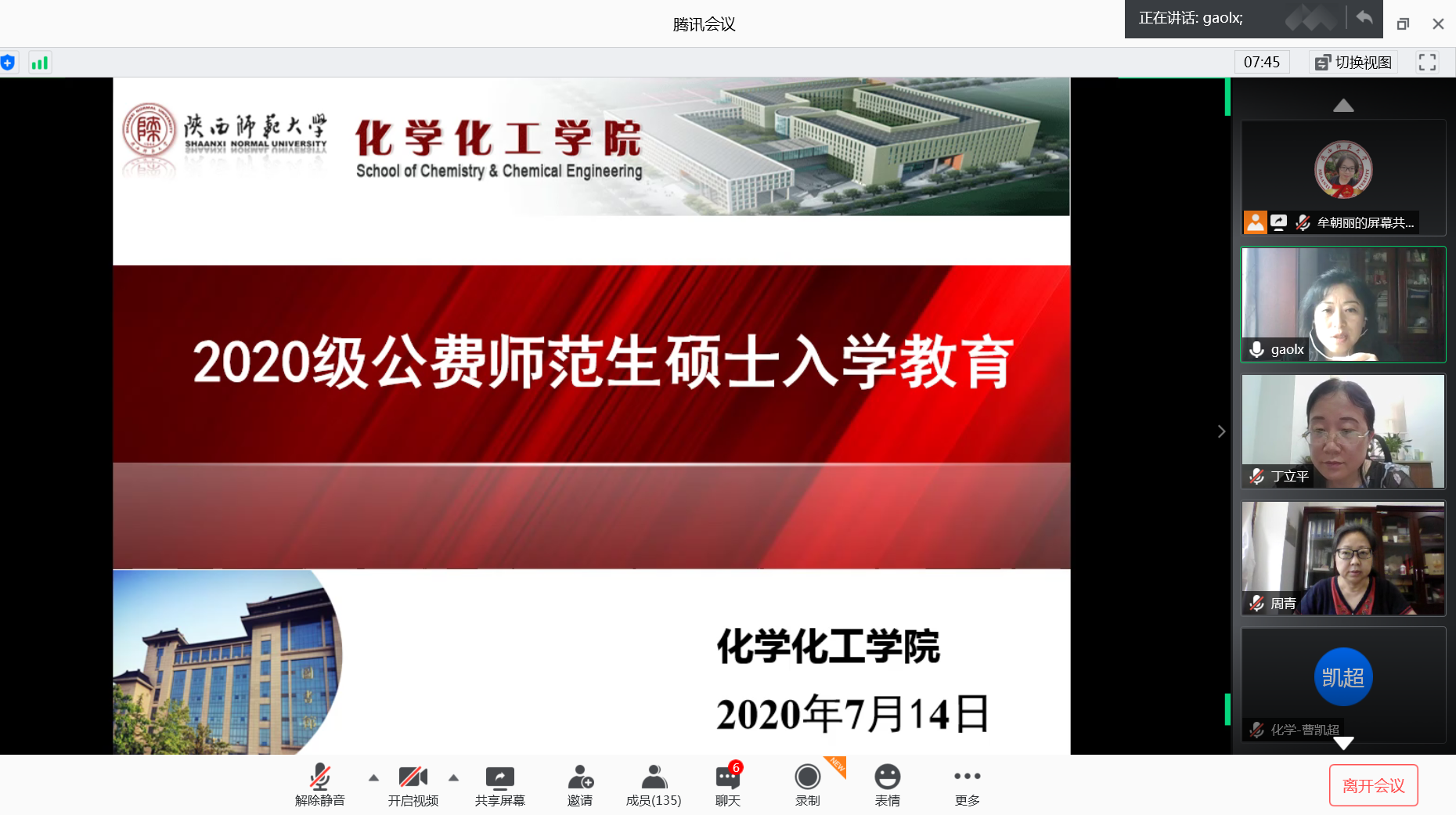7月14日下午,公司利用腾讯会议举行了2020级公费师范生教育硕士入学教育大会。公司党委书记高玲香、副经理丁立平、周青教授、研究生辅导员牟朝丽、公费师范生教育硕士秘书曹凯超以及2020级公费师范生教育硕士出席了本次会议,会议由研究生辅导员牟朝丽主持。