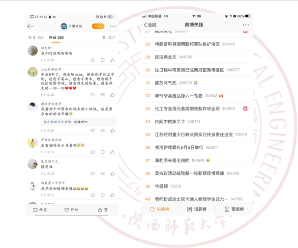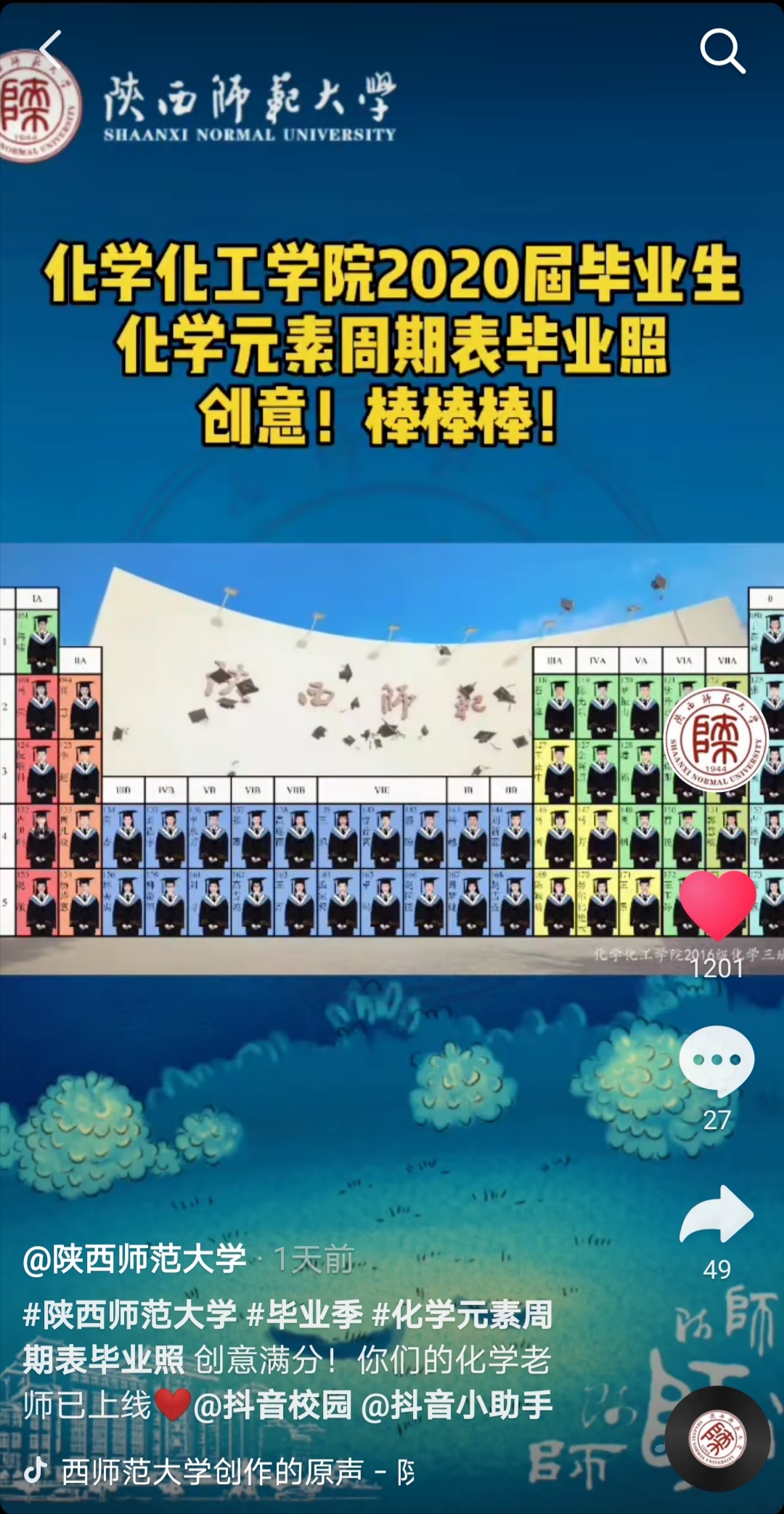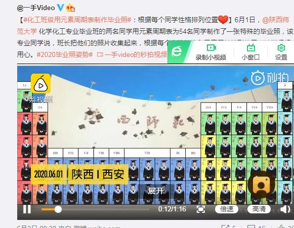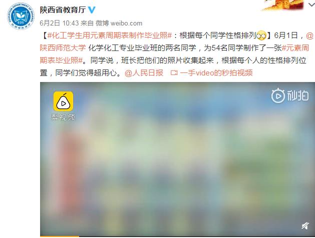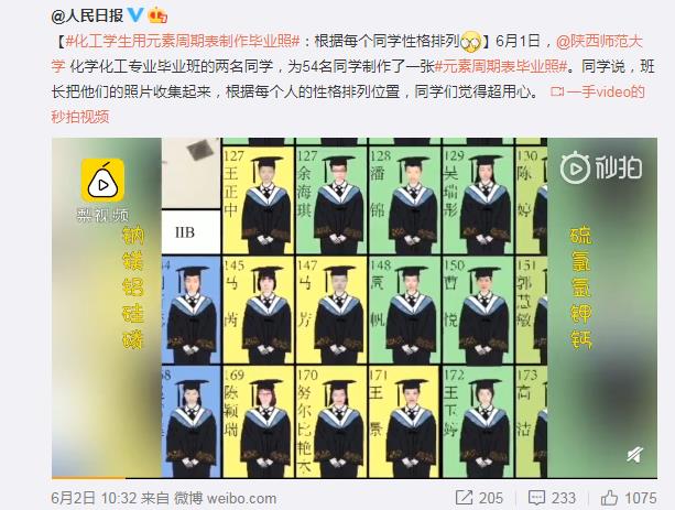 6月1日,公司2016级化学专业的江宇和张桐两位同学,根据化学元素周期表中元素的特性与每个人性格的契合度,为全班54名同学制作了一张特殊的云毕业照,极富创意的毕业照引发不少微博用户关注,迅速登上微博热搜榜。随后,BEAT365英国官网网站、人民网、陕西省教育厅、梨视频、抖音、腾讯等多个新媒体平台纷纷转载报道,在校内外引起热烈反响。