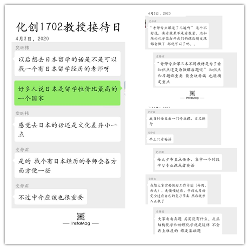 4月3日化学(创新实验)1702班邀请了党静霜老师参加“教授接待日”活动,本次活动以线上文本会议形式进行,师生主要围绕考研复习备考过程进行了交流。针对同学们想了解的考研选择公司、专业课复习方法、复习过程中调整心态的方法等问题,党老师结合自己的考研经历和专业背景,为同学们答疑解惑,耐心给出同学相应的有效应对措施,提出要求和建议。两个多小时后,同学们表示受益匪浅,有了自己较为适合的目标和清晰的学习规划,会按照科学的复习方法,准备迎接即将到来的考研!