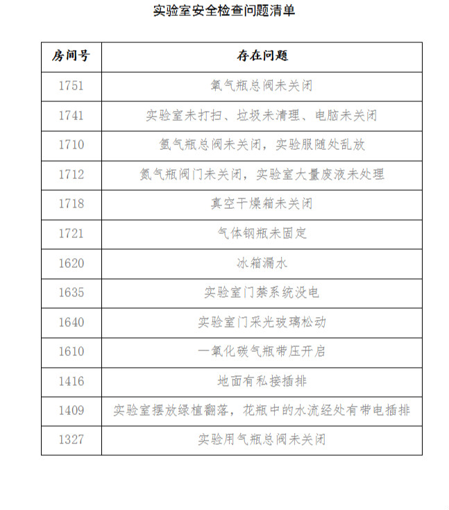 检查组采取逐个房间过、逐个点位查的方式,通过实地查看、亲身操作,先后对公司各楼层科研实验室、化工楼小三层、公共区域,进行包括实验场所安全,安全设施、基础条件安全,实验气体、压力容器管理等内容的细致检查。检查发现,绝大多数实验室对安全管理比较重视,基本能达到疫情期间实验室关闭安全管控标准,但还存在部分实验场所卫生打扫不彻底、物品摆放凌乱、实验气瓶阀门未关闭、插排未断电、少数人员做实验不戴护目镜等突出问题。
