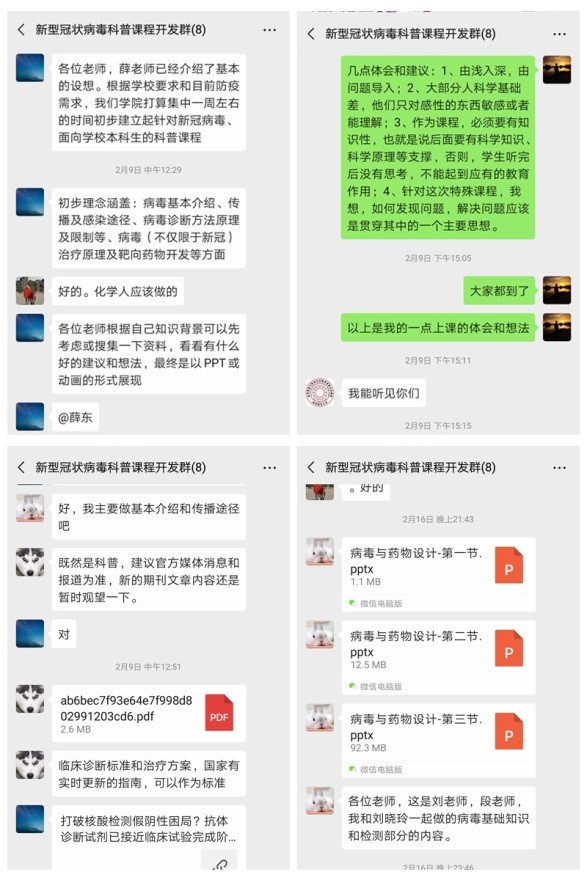 此外,为引导员工科学看待和认识本次疫情,充分认识化学的重要性,由薛东教授负责的一门线上混合教学通识教育选修课——《新型冠状病毒防控、检测与药物研发概论》(暂定名)已经初步建立完成并即将上线。该课程由薛东、丁立平、刘成辉、段新瑞、黄治炎、汤薇等教师在开学前集中一周时间,根据各自学科背景积极搜集整理各类资料建立完成。课程内容涵盖病毒基本介绍、传播及感染途径、病毒诊断方法、药物开研发等方面的内容,具备科普性和知识性,是面对全校师生的一门科普性课程。