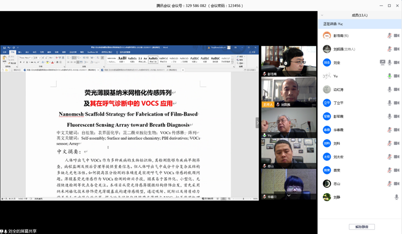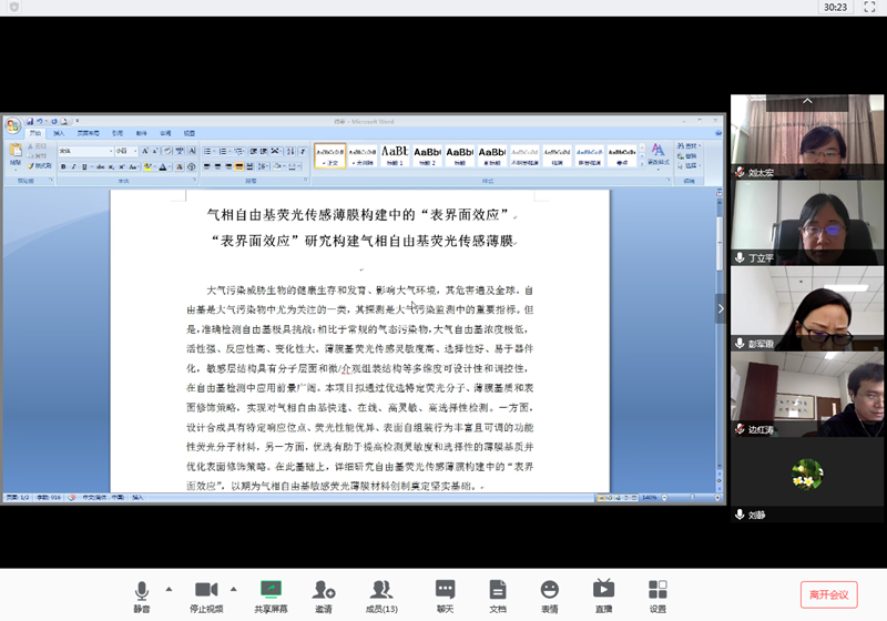 为贯彻公司推进国家自然科学基金项目申报工作的通知,做好2020年度团队人员基金项目申报工作,加强指导,提高申报质量。 3月12日下午,光子鼻与分子材料研究团队举行了一场国家自然科学基金项目书内部评审云端辅导会。辅导会由丁立平教授主持,房喻教授、边红涛教授、刘静教授、刘凯强教授、彭军霞副教授、彭浩南副教授、刘太宏副研究员等团队人员参加并提出建设性意见。