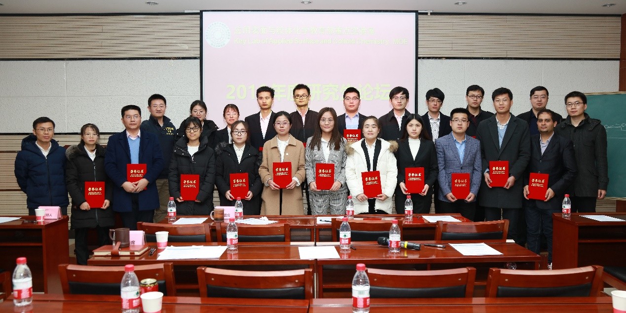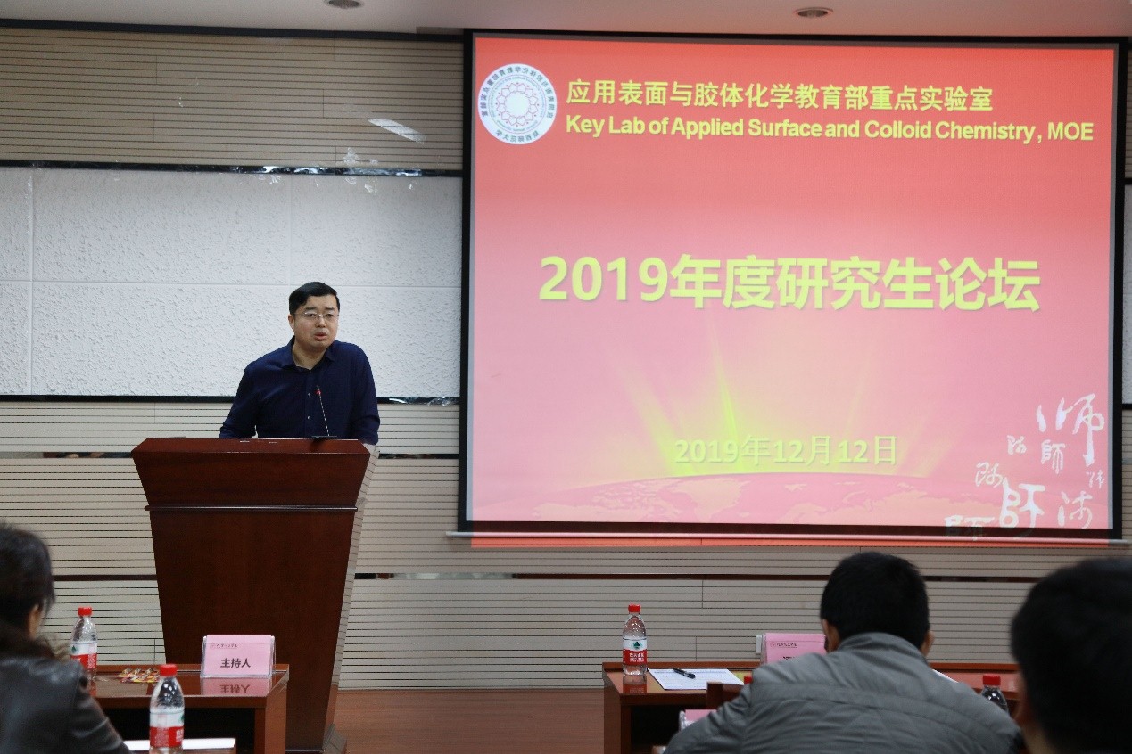 应用表面与胶体化学教育部重点实验室2019年度研究生论坛于12月12-13日在长安校区致知楼1668/1568室举行。本年度研究生论坛分由博士生汇报和特邀报告两个环节组成,薛东教授、刘成辉教授、丁立平教授、曹睿教授、陈亚芍教授、雷志斌教授、李兴伟教授、许春丽教授、唐艳丽教授、翟全国教授、何晓明教授、王长号副教授、张伟副教授、边红涛研究员、王超教授、赵奎教授、杨周副教授等重点实验室100余名师生参加了本次论坛。