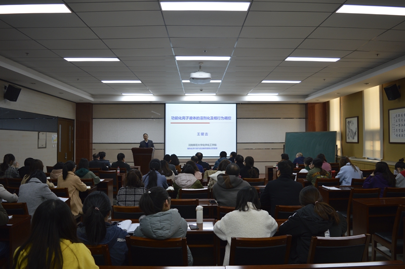 王键吉教授从“离子液体的界面效应”、“绿色分离及相行为”、“离子液体的生物效应”以及“离子液体与生物质的高效利用”等四个方面系统阐述了课题组近年来围绕电解质溶液的微观相互作用、离子液体溶液的介观结构、复杂体系的相行为调控等方面所开展的工作及重要研究进展。报告内容丰富、系统深入,为与会师生提供了十分重要的研究思路;报告结束后,王键吉教授与现场师生展开热烈、深入的讨论,参会师生受益匪浅。
