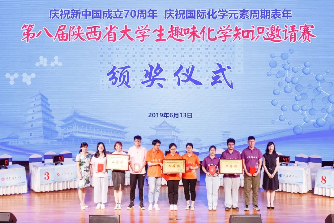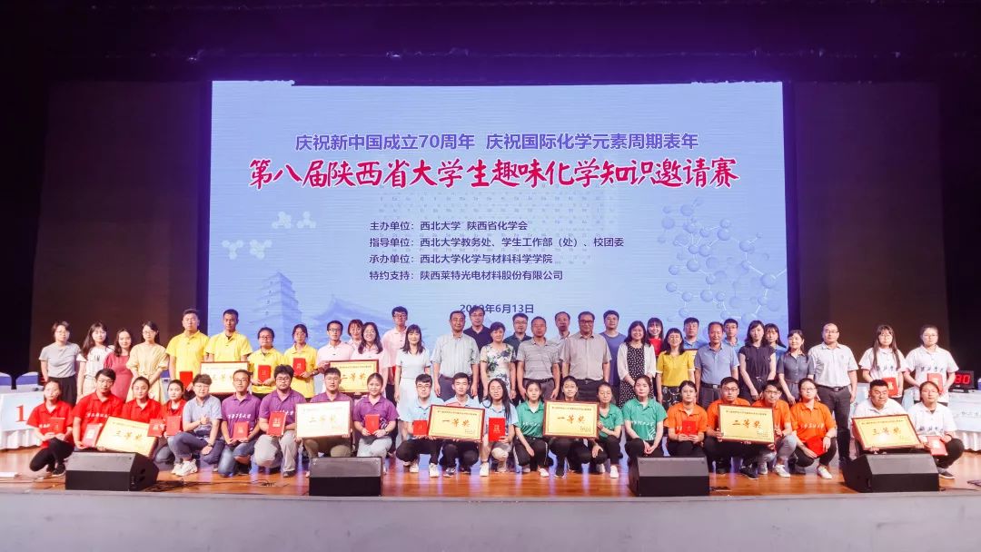 6月13日晚,由陕西省化学会、西北大学主办的第八届陕西省老员工趣味化学知识邀请赛在西北大学长安校区圆满落幕,公司本科生雷茗、陈颖瑞、彭兴、江宇四名同学组成的代表队以总分第三名的成绩荣获二等奖,雷茗同学获得“优秀选手”称号。