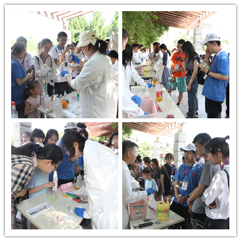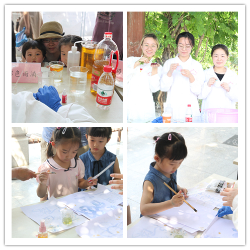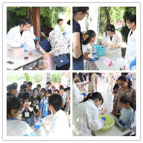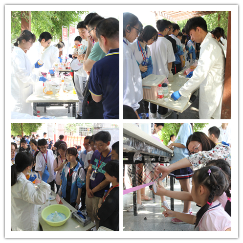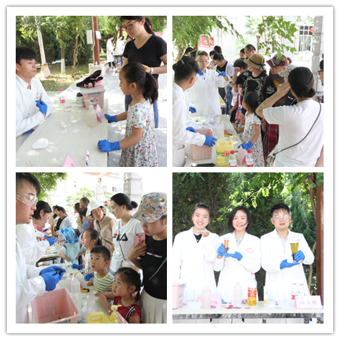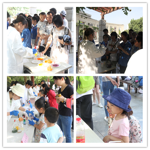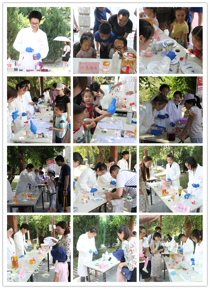 活动吸引了公司各公司员工、来公司游学的中员工、师大社区群众等驻足观看,实验小组为观众带来包括动手拼装、展示讲解、实验演示等不同类型的18个化学元素相关活动,分别是:火山爆发、神奇的红茶、彩色雨滴等。现场观众在演示小组的指导下也尝试动手操作实验。来自商公司的一位同学是个化学爱好者,他和现场演示小组一起兴致勃勃地探讨起多个实验的原理。来自数科院的殷怡琳同学更是感慨生活处处皆化学,在经过做实验的同学精心讲解之后,自己仿佛打开了新世纪的大门,化学不再是神秘的学科,而是生活中充满趣味的伙伴。来自兰州二中的一位女同学表示:很开心这次研学之旅中有机会观摩来自师大化公司哥哥姐姐们的实验展示,实验都非常有趣,让我们看到了不一样的多彩的化学,也非常期待将来能到师大化学专业学习。带着孩子围观的家长们也纷纷表示实验很有趣,实验现象精彩纷呈,也让他们有了在家里通过实验的形式给孩子们科普知识的想法。