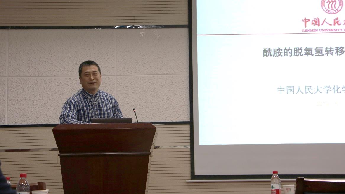 中国人民大学徐立进教授作题为“酰胺的催化脱氧转移氢化反应研究”的报告。报告主要从以氨硼烷为氢源的有机硼催化去氧还原酰胺反应研究,以甲酸/三乙胺为氢源的过渡金属钌催化去氧还原酰胺反应研究,以及有机硼玩一锅法合成1,2,3,4-喹喔啉反应研究三方面进行了详细的阐述。