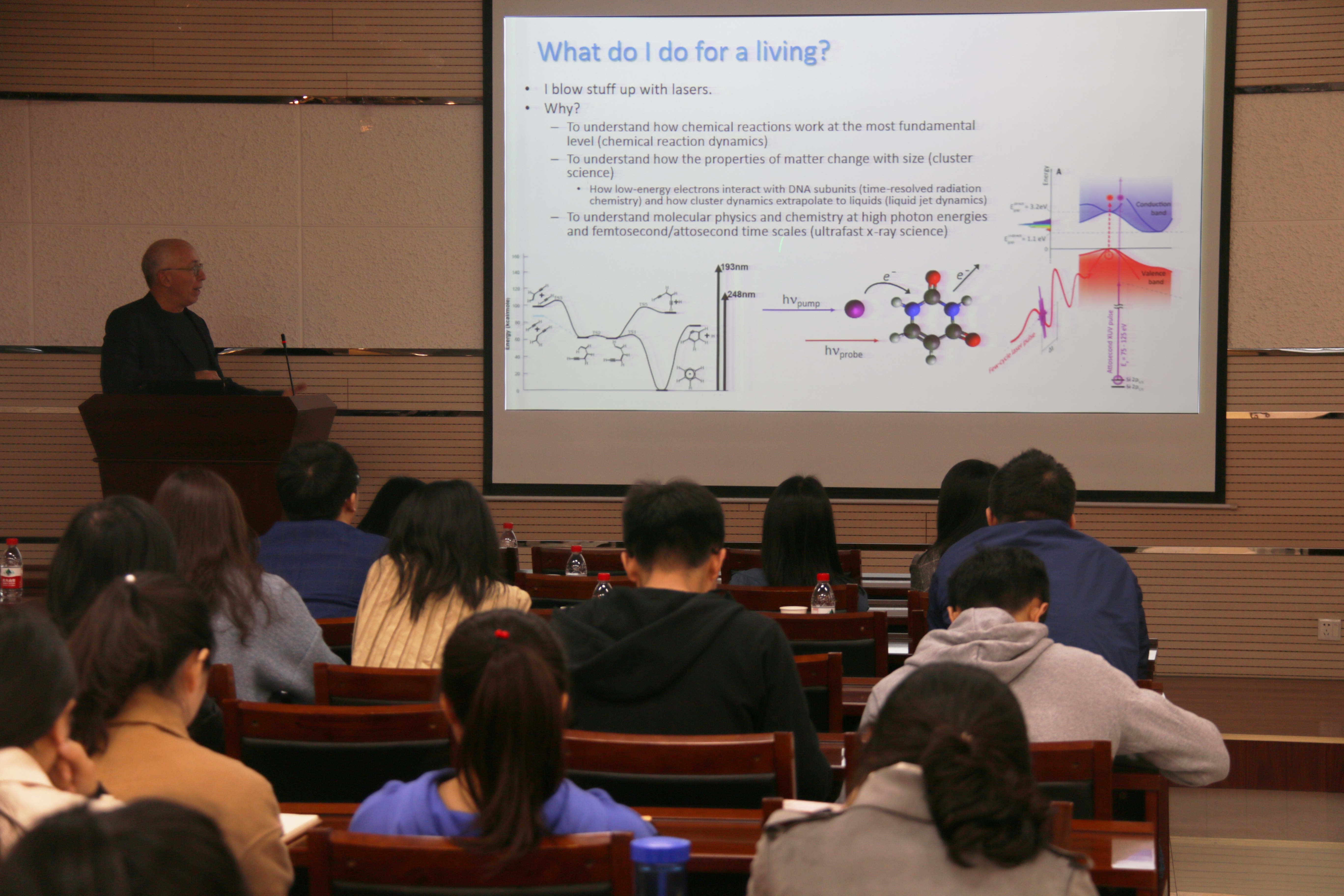 本次报告前,房喻教授对Daniel M. Neumark教授的科研经历做了介绍。Daniel M. Neumark教授是国际著名的物理化学家,入选美国国家科公司院士、美国艺术与科公司院士、美国科学促进会会士、美国物理学和化学会会士、英国皇家化学会会士。Neumark教授曾获美国化学会Irving Langmuir奖、美国物理学会Herbert P. Broida奖、英国皇家化学会Chemical Dynamics奖等多项荣誉,现任Science审稿编委,J. Chem. Phys.、J. Phys. Chem.、Chem. Phys. 、Phys. Chem. Chem. Phys.等杂志编委。