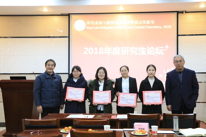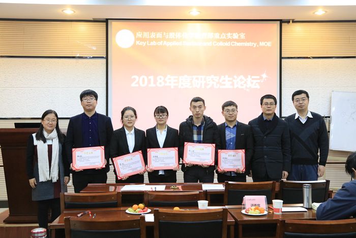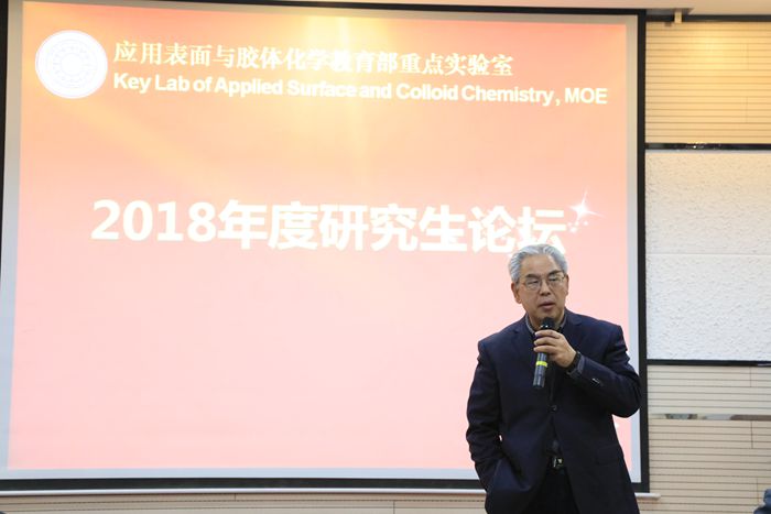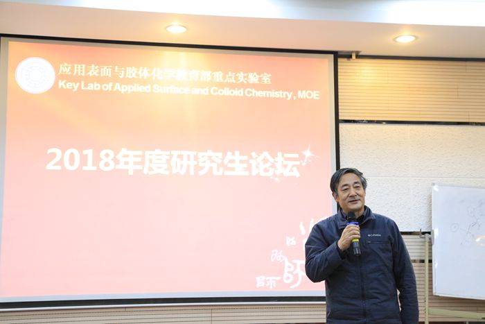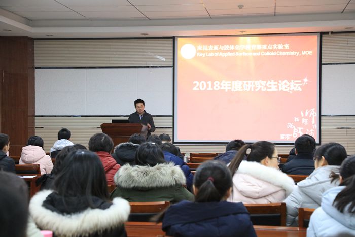 应用表面与胶体化学教育部重点实验室举办的2018年度研究生论坛于2019年1月5日在长安校区致知楼1668/1568会议室成功举行。论坛由重点实验室副主任曹睿主持,张生勇院士、房喻教授、白俊峰教授、张成孝教授、薛东教授、丁立平教授、雷志斌教授、唐艳丽教授、蒋加兴教授、张耀东教授、刘成辉教授等重点实验室150余名师生参加了本次论坛。首先,论坛主持人曹睿介绍了本次论坛的基本情况。他说,研究生论坛是重点实验室重要的例会,本次论坛共有25位博士生参加,其中24位是2017级在读博士生,1位是导师推荐的优秀博士生,论坛报告分为两个会场同时进行。本次论坛邀请了张生勇院士参会并讲话,张院士勉励参会员工珍惜时间,勤勉奋斗,努力实现自己的科研理想,并预祝论坛取得圆满成功。