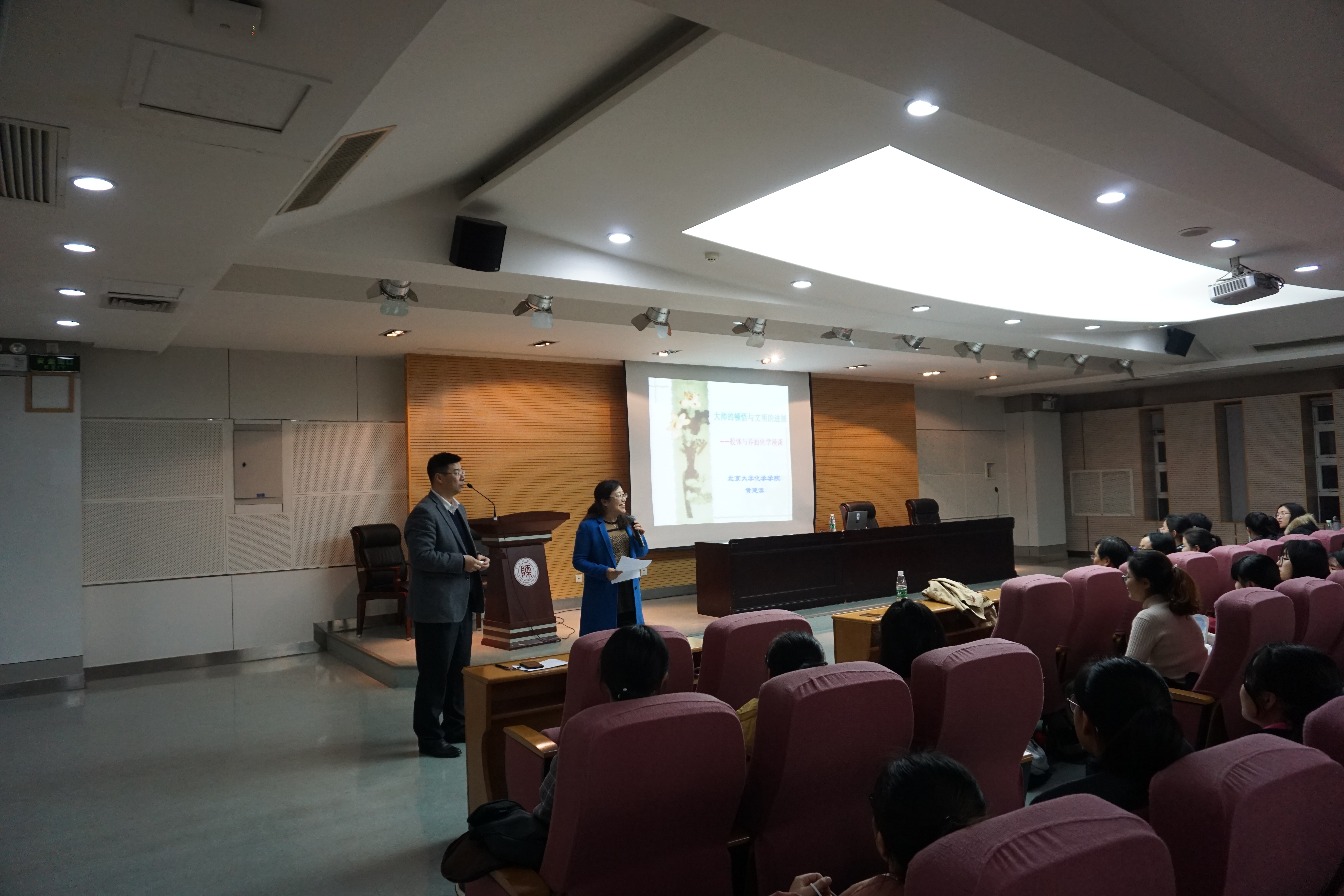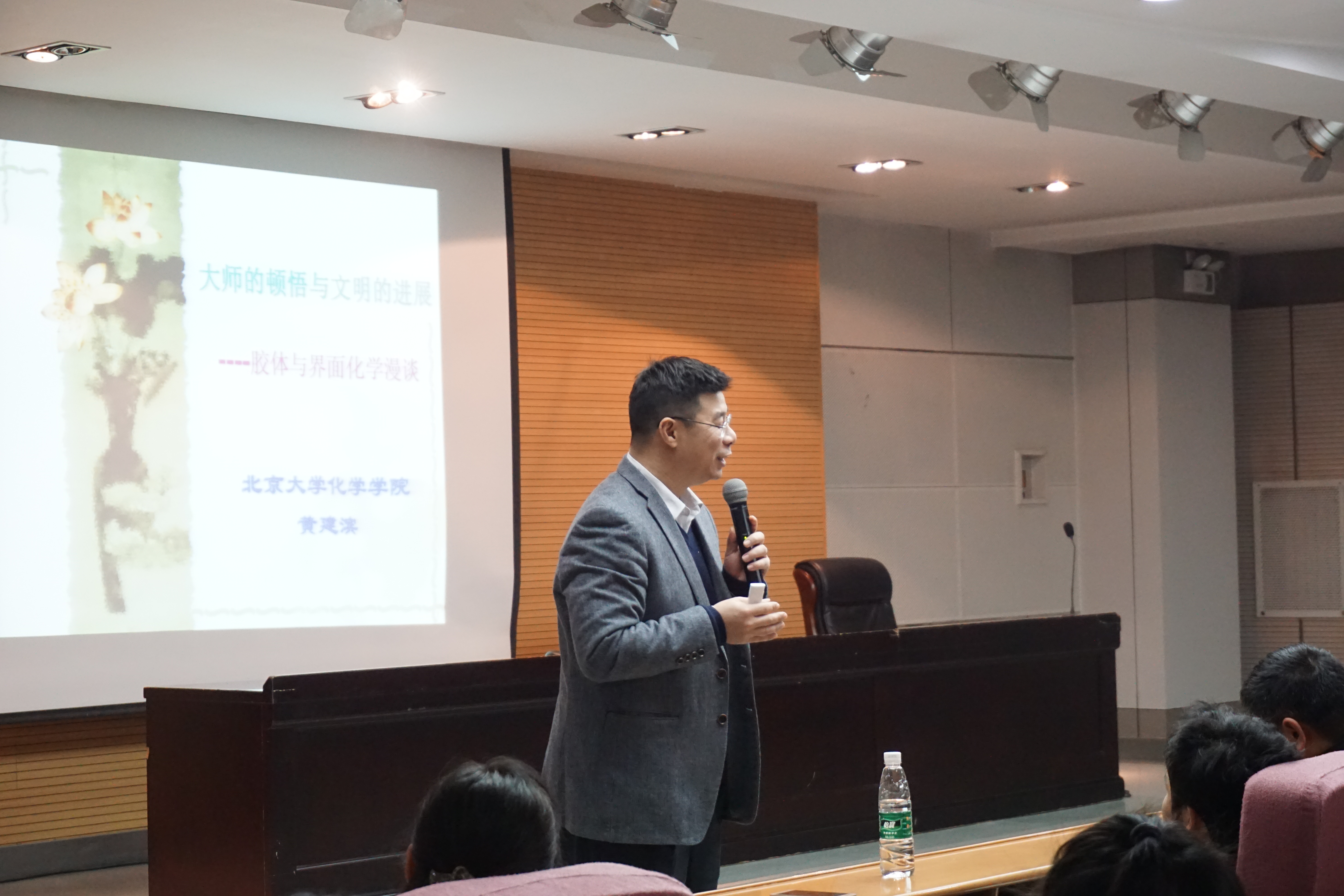 2018年11月30日晚7:30,北京大学化学公司教授、博士生导师黄建滨教授应邀为公司本科生做报告,报告主题为“大师的顿悟与文明的发展――胶体与界面化学漫谈”。讲座在雁塔校区崇鋈楼三层归仁堂举行,公司陈亚芍教授主持,共两百七十多名员工到场聆听。