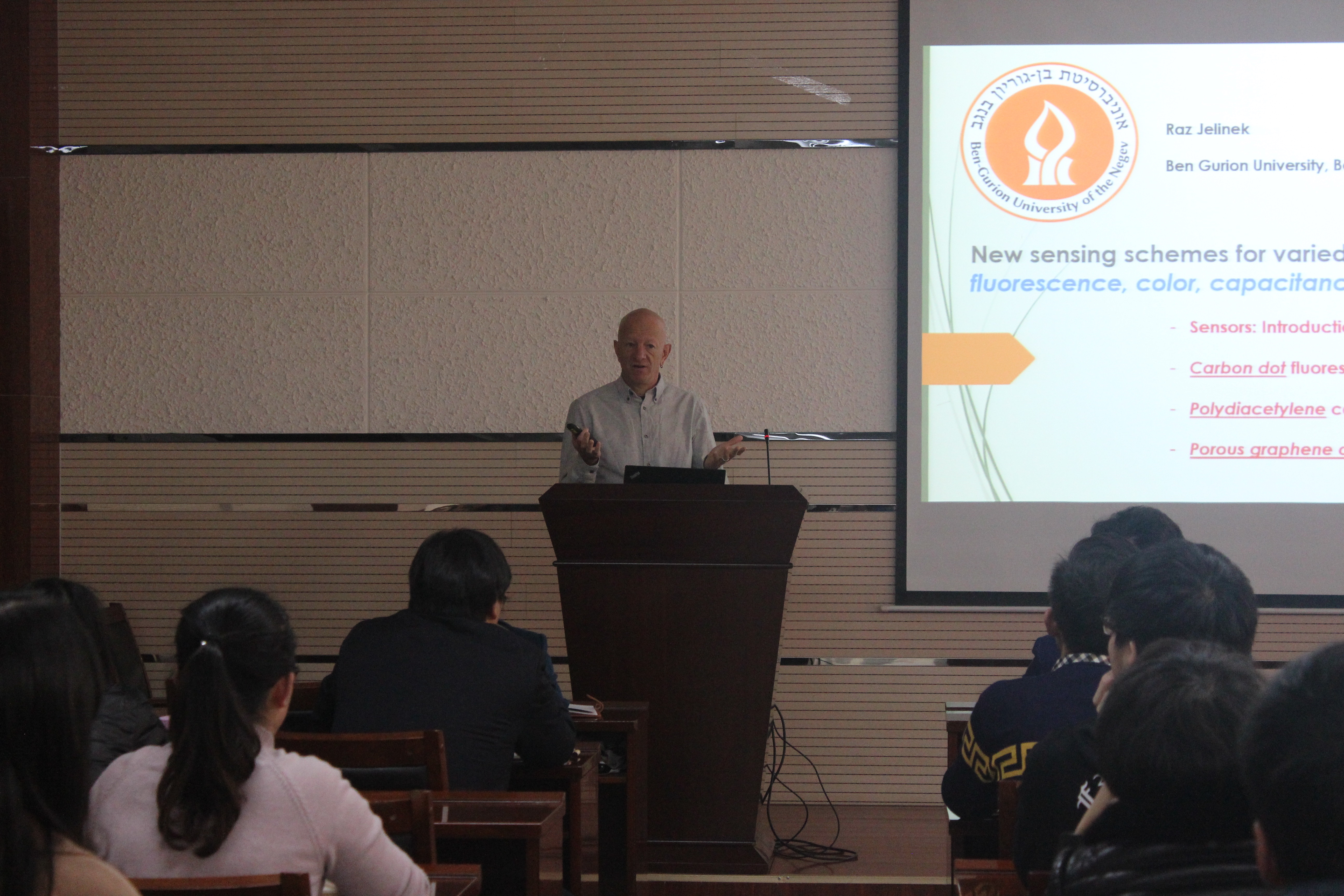 11月9日下午,以色列本-古里安大学Raz Jelinek教授应邀访问公司进行学术交流,并在致知楼1668报告厅为公司师生带来了题目为“New Sensing Schemes for Diverse Biological and Chemical Targets”的报告。公司唐艳丽教授、漆红兰教授、边红涛教授、丁立平教授、刘太宏、彭浩南、刘全、王刚和Somnath Mukherjee博士等以及公司相关专业研究生和本科生聆听了本次学术报告。报告会由丁立平副经理主持。