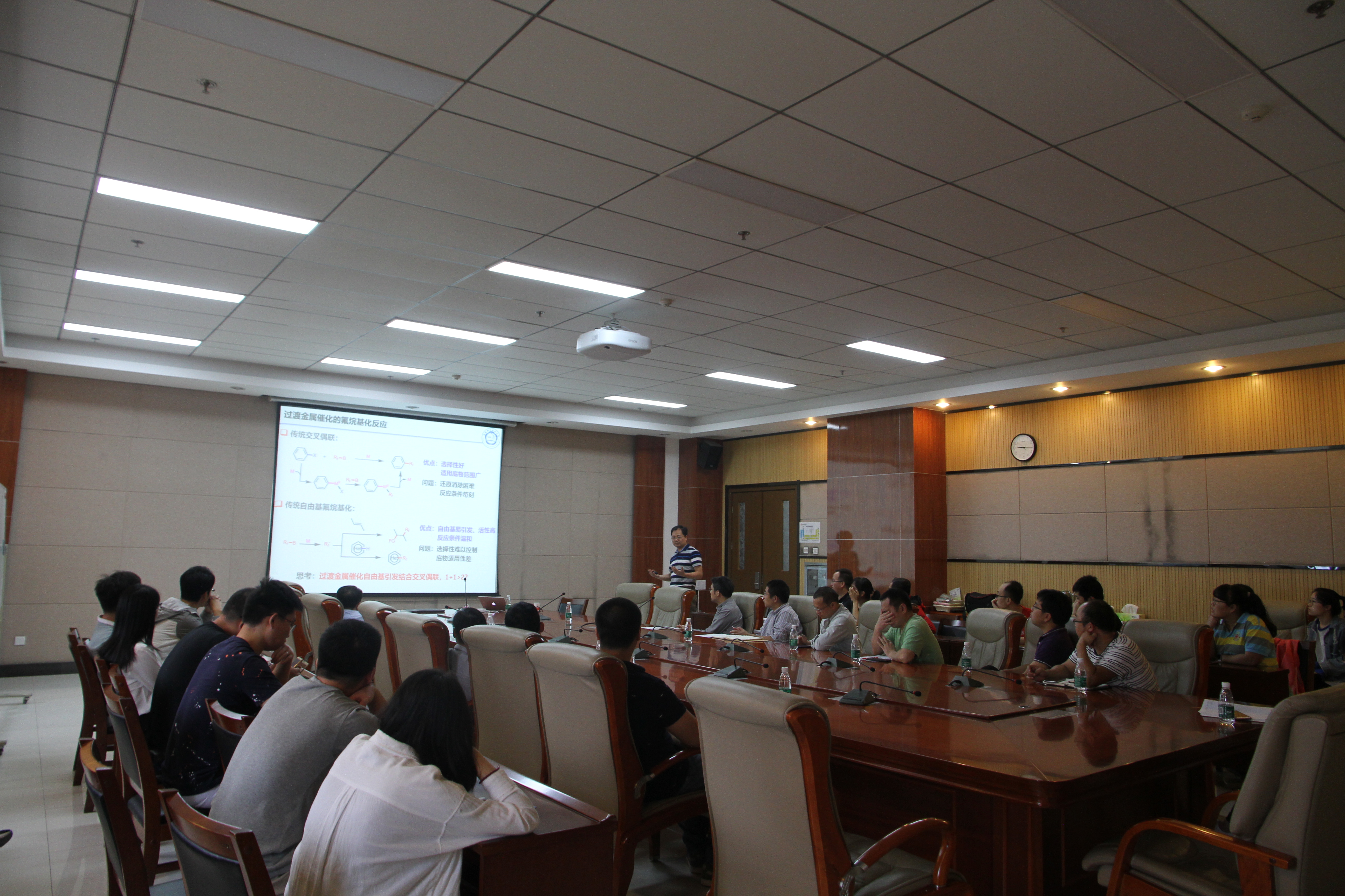 王细胜教授首先系统概述了其课题组在镍催化的氟烷基化反应研究的系列工作。其次,他介绍了其课题组在含氟自由基引发体系中的一些新发现,如: 实现了镍催化芳基卤化物与氟烷基化试剂还原偶联反应的最新成果。最后,在上述工作基础上,他展示了对过渡金属促进的若干基于含氟自由基途径的新反应体系的研究成果。报告中,王教授课题组近几年所取得的研究成果,以及王教授严谨的科研态度,给在座师生留下了深刻的印象。在互动交流环节,王细胜教授与在座师生进行了热烈讨论,对师生的积极提问给予了详细的解答。