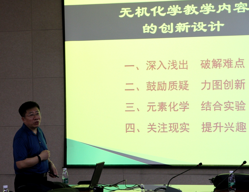 徐家宁教授以“无机化学教学内容的创新设计”为题做了报告,徐家宁教授重点介绍了如何做好无机化学教学方面的工作,以具体实例和公司老师分享了自己多年的从教经验。宋天佑教授以“做好教学工作的实践与思考”为题做了报告,他重点总结了吉林大学无机化学教学几十年以来的教学成果,分析了各时代教学方式与观念的变化,对当代新型教学形式--网络公开课及慕课进行了展望。