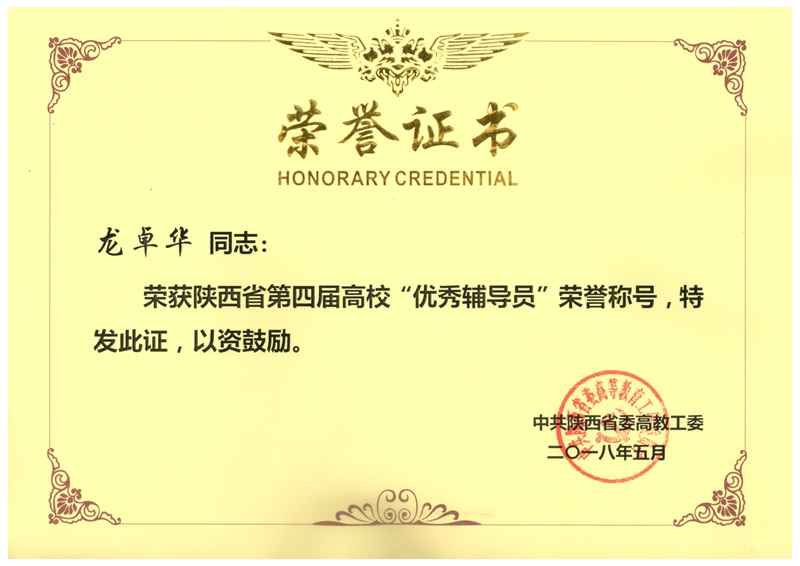 近日,由中共陕西省委高教工委主办的陕西省第四届高校十佳辅导员和优秀辅导员评选表彰活动结果揭晓,公司本科生辅导员龙卓华荣获“陕西高校优秀辅导员”荣誉称号。