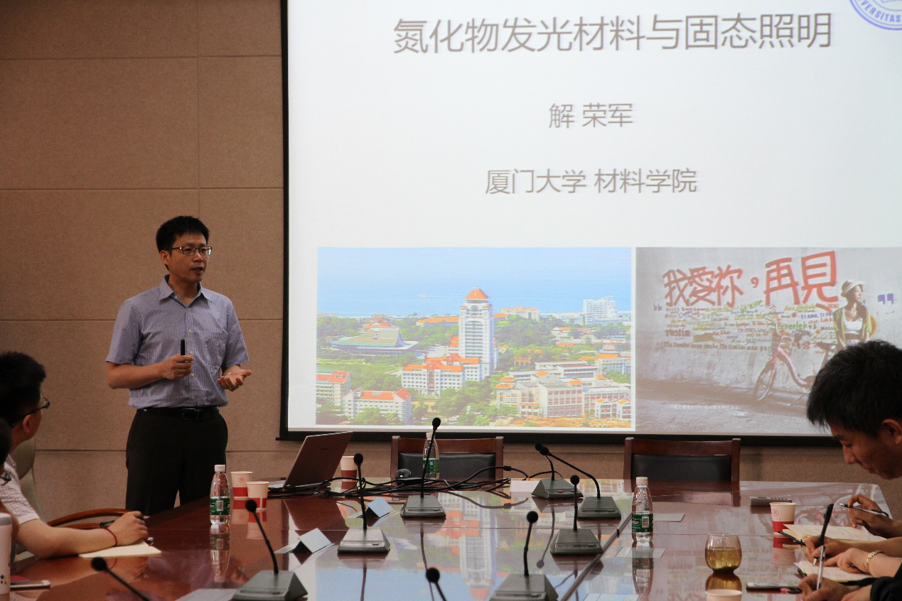 5月18日,厦门大学解荣军教授受邀来beats365唯一官方网站学术交流,在致知楼1568会议室为公司师生带来了题为“氮化物发光材料与固态照明”的学术报告。物理公司郑海荣教授、材料公司苟婧副教授、高级实验师晁小练,公司副经理焦桓教授、刘志宏教授等教师及相关专业研究生、本科生参加报告会。报告会由焦桓主持。