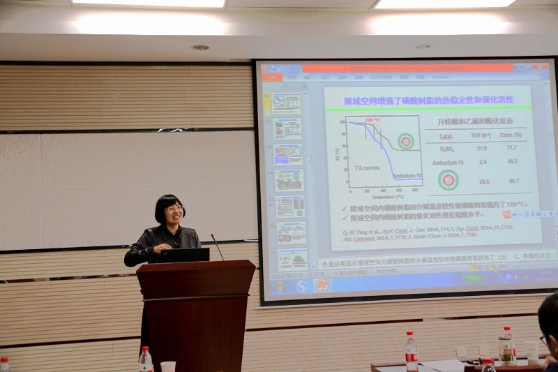 杨启华研究员一直致力于有机-无机杂化多孔催化材料创制的基础研究,利用有机-无机杂化的概念合成了表面性质可控、活性中心微环境可调的新型有机-无机杂化多孔催化材料。在本次报告中,杨启华研究员给大家分享了她实验室最新的研究成果,展示了纳米反应器中的催化反应既具有与均相催化相媲美的活性和选择性,又兼具多相催化可回收、易分离的应用潜力。最后,杨启华研究员作为编委还向我们介绍了国内催化类期刊《催化学报》的发展目标,鼓励我们国内学者支持和发展具有国际影响力的本土期刊。