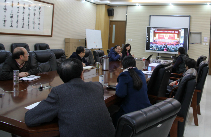 上午9时,与会人员集体收看了十三届全国人大一次会议开幕会直播。听取李克强总理对过去5年工作的回顾和对2018年工作的部署。