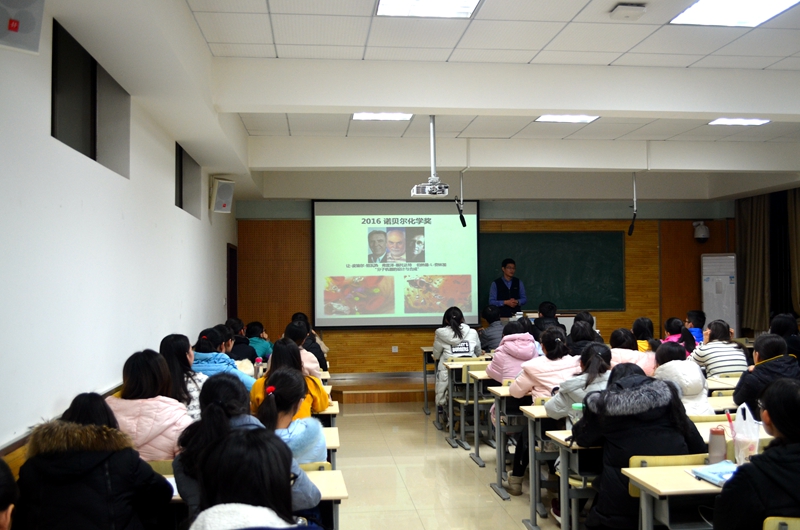 报告开始后,翟全国教授首先介绍公司无机化学教学组的学术团队和代表成果,接着从专业角度为同学们解读了配合物在无机化学领域的重要作用,重点分析了x单晶衍射技术对配合物结构及性质检测的作用。他还结合科技前沿信息,从2016年的诺贝尔化学奖带领同学们了解了“分子机器的设计与合成”。