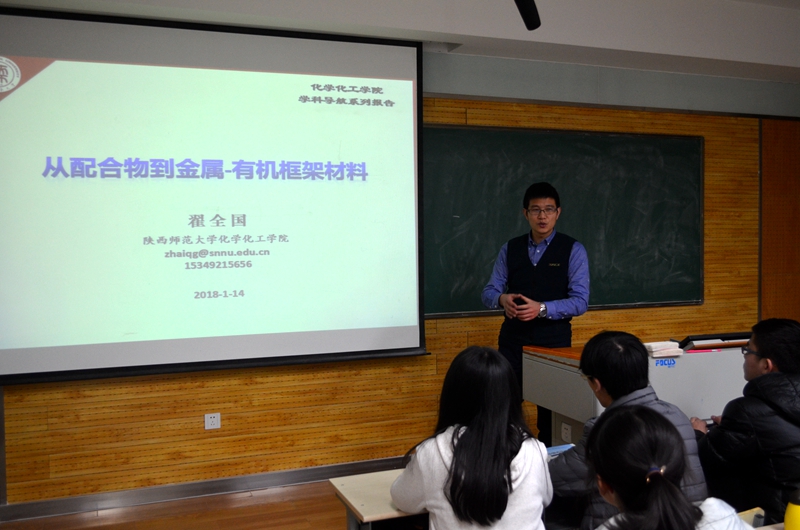 1月14日晚,公司“学科导航-化学与化学发展”报告会在雁塔校区5108教室举行,翟全国教授做了“从配合物到金属——有机框架材料”的主题报告。报告会由2017级辅导员龙卓华老师主持,公司2016级、2017级本科生和其他专业员工代表共计100余人到场聆听了报告。