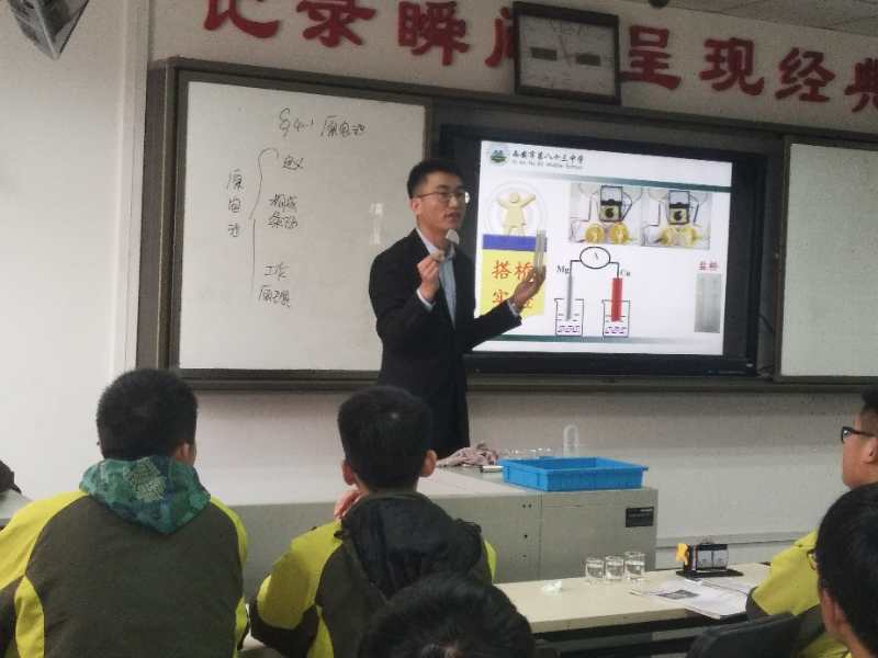 接下来,同学们观摩了公开课《原电池的化学反应原理》。白永龙老师授课语言风趣幽默,员工们对实验参与度高,充分体现了高效课堂的理念。课后讨论中,同学们向白老师请教了关于大学学习和年轻教师在岗位上遇到的问题,白老师分享了他的教学经历,并为同学们在备课和班主任工作等方面进行了指导。
