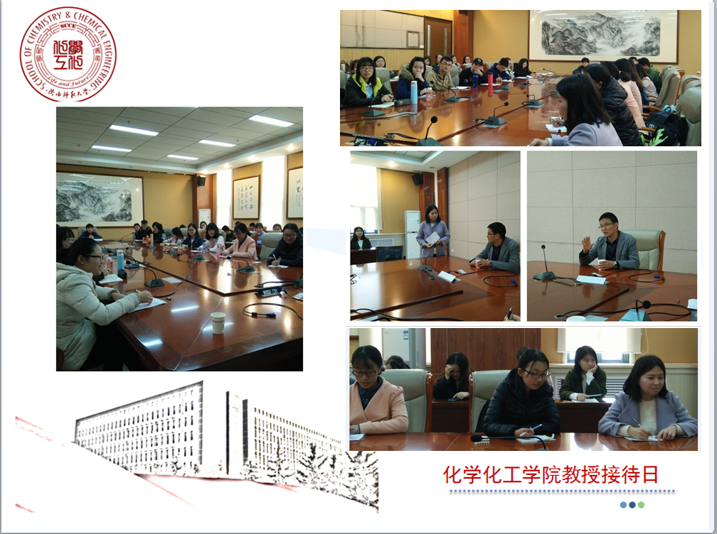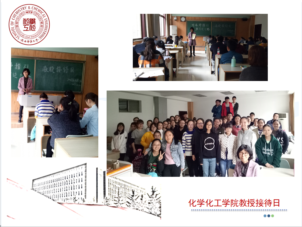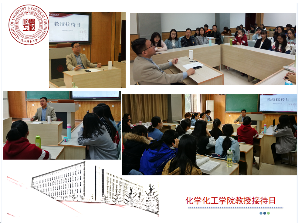10月30日上午,徐峰教授应邀参加了2016级应用化学一班的教授接待日活动。在轻松愉快的氛围中,徐老师用诙谐幽默的语言向同学们讲述了自己的求学之路的艰辛,并用身边的事例告诉大家,老员工应该尽快适应社会,面对现实压力的同时也要学会调节心理压力。对于同学们考研就业方面的问题,徐老师指出,要选择适合自己的、同时也要适应社会需要的人生道路。最后,徐老师鼓励同学们出国留学,通过自己坚持不懈的努力,实现人生目标。