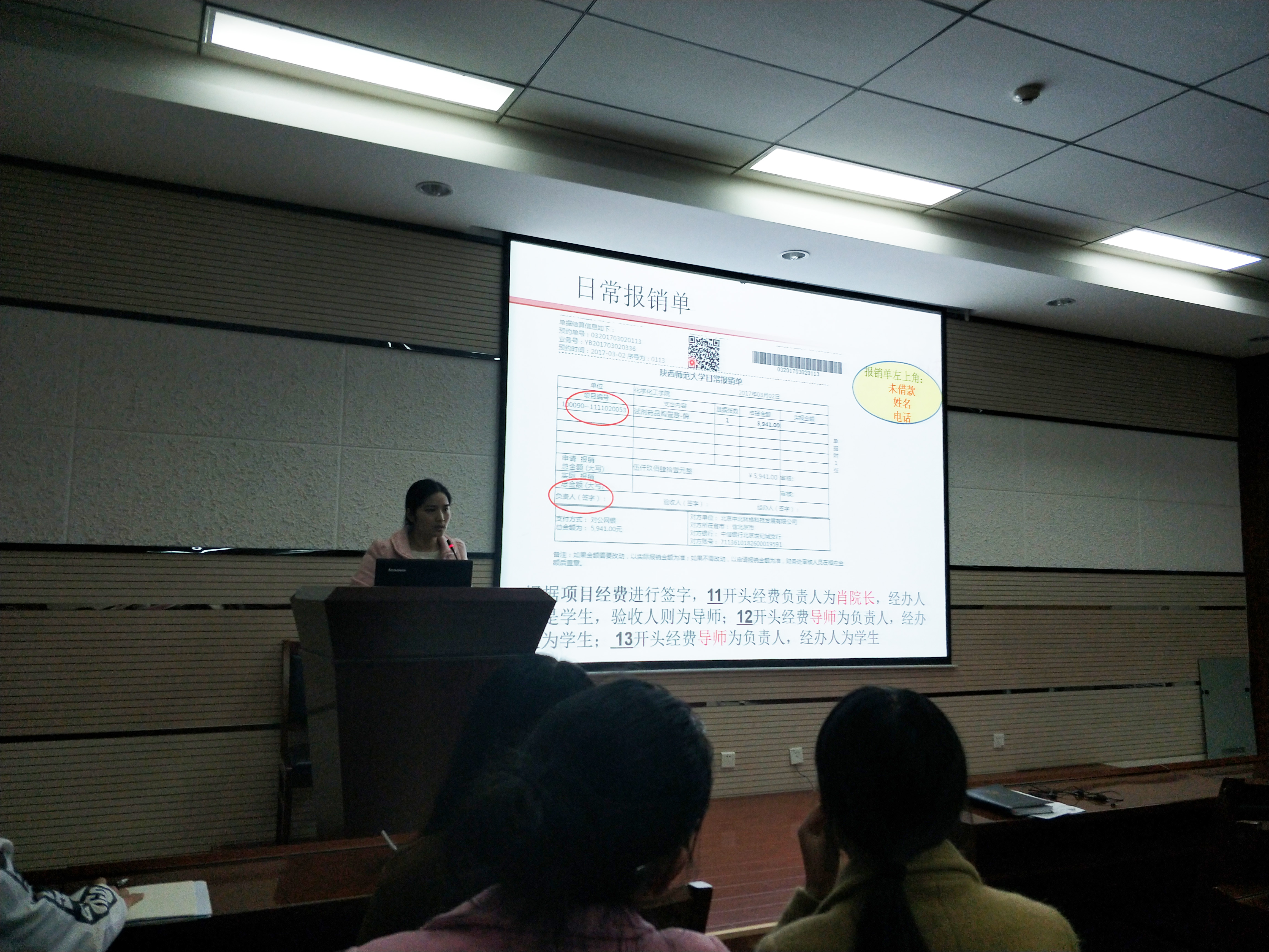 正值年末公司财务报销高峰时期,秉承服务广大师生,提高财务报销效率,降低退单率的原则,在公司肖新军副经理的提议下,经公司财务助理张伟和赵慧茹的精心组织,公司于2017年11月1号晚上7点在致知楼1668会议室,为公司师生进行了一场题为“网上财务报销基本知识及常见问题”的讲座,公司近150多位师生参加。讲座由公司具有5年丰富报账经验的分析化学专业博士生孙圆圆同学主持并讲解。