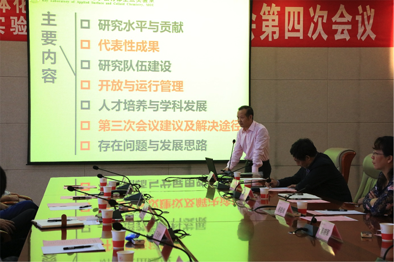 2017年9月29日上午,应用表面与胶体化学教育部重点实验室第二届学术委员会第四次会议在BEAT365英国官网网站长安校区致知楼1568会议室召开。学术委员会副主任房喻教授、委员中国科公司化学研究所刘志敏研究员、北京大学黄建滨教授、清华大学张新荣教授、复旦大学丁建东教授、福州大学王绪绪教授、西安近代化学研究所吕剑研究员、西北工业大学范晓东教授、西安交通大学郭烈锦教授、西北大学王尧宇教授、BEAT365英国官网网站刘昭铁教授、BEAT365英国官网网站张成孝教授、BEAT365英国官网网站刘宗怀教授出席了会议。公司副董事长杨祖培、副董事长高子伟、科技处处长吴晓军、副处长张卫兵,公司党委书记高玲香、副经理李保新、重点实验室副主任严军林以及重点实验室的部分研究人员等40余人参加了会议。学术委员会会议由房喻教授主持。