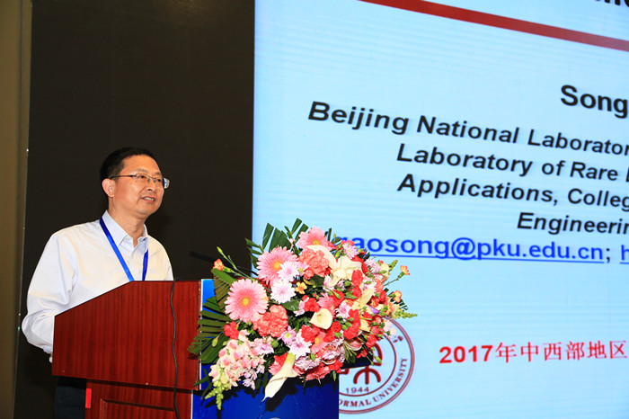 2017年中西部地区化学化工学术研讨会期间,共举行5场大会报告。4月29号上午,续开幕式后,会议安排的4个大会报告随即在陕西宾馆陕西大会堂举行。会议安排的上半场的两场大会报告分别由中山大学陈小明院士主持,北京大学高松院士作了题为“Ferroelectric Molecular Magnets & Organometallic Single-Ion Magnets”的报告;南京大学孙为银教授主持,中国科学技术大学谢毅院士作了题为“低维固体的激子过程调控及其光催化应用”的报告。