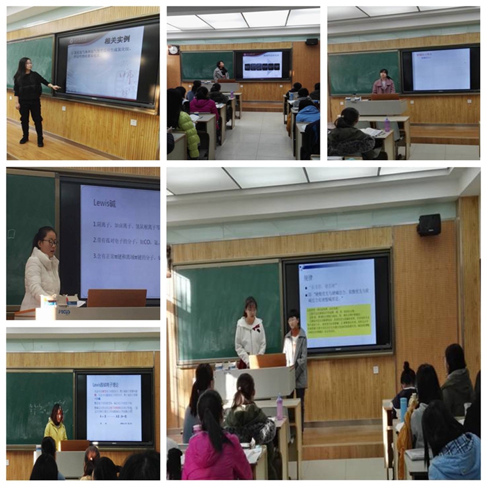 此次活动全班分为四个小组,每个小组自行选择2016级化学卓越班项目主任、无机化学主讲老师胡满成教授所给四个课题的其中一个进行准备。课题分别为:阿累尼乌斯酸碱理论;布朗斯特—劳莱酸碱理论;路易斯酸碱理论;软硬酸碱理论。本次活动共有7位同学上台试讲,经过同学们的精心准备,大家各显身手,展现自我,同学们一致认为,要上好一节课是不容易的,自信、大胆、主动、积极、坚持是课堂效果良好的先决条件。最后,对同学们的表现,老师作了总结点评,指出了优点,同时又点明了存在的不足,此次活动大家受益匪浅,达到了预期的目的。