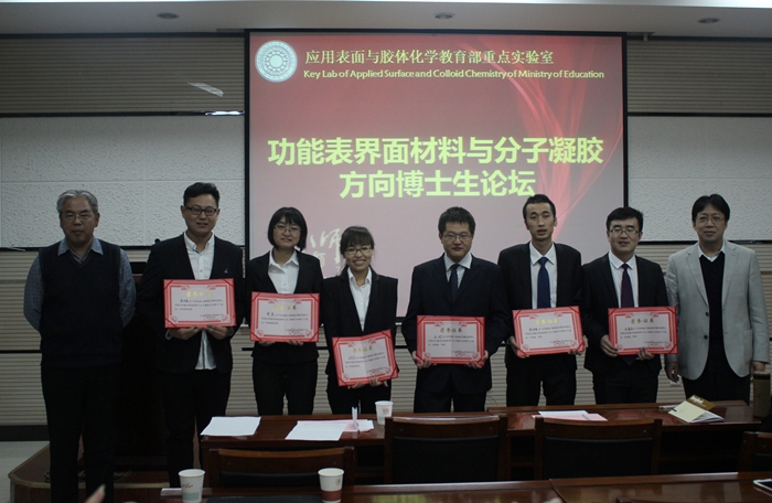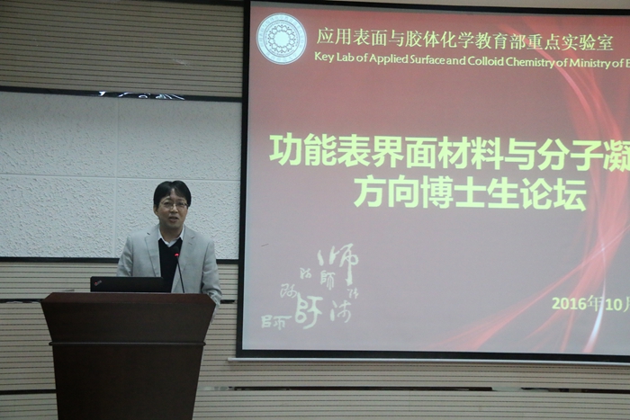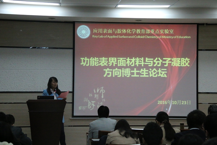2016年10月23日下午,由应用表面与胶体化学教育部重点实验室主办的“功能表界面材料与分子凝胶方向博士生论坛”在致知楼六层报告厅顺利举行。beats365唯一官方网站房喻教授、董文生教授、焦桓教授、丁立平教授、陈亚芍教授、刘守信教授、张颖教授、雷忠利教授、张国防教授、杨鹏教授、刘静副教授、彭军霞副教授,刘凯强副教授等教师以及相关专业研究生参加了此次论坛。