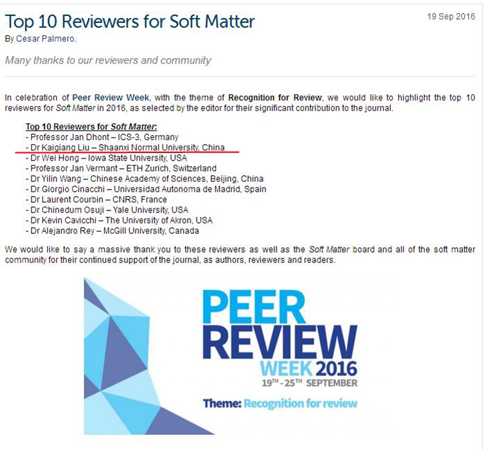 9 月 19-25 日是 2016 年度全球 Peer Review Week 周,今年的主题是 “Recognition for Review”,旨在表彰为期刊出版、基金评审、会议申请等一系列工作作出重大贡献的评审人员。本届 Peer Review Week 期间,英国皇家化学会评选出了旗下 43 本期刊每本期刊的十佳评审人。公司刘凯强博士荣获《Soft Matter》期刊十佳审稿人。