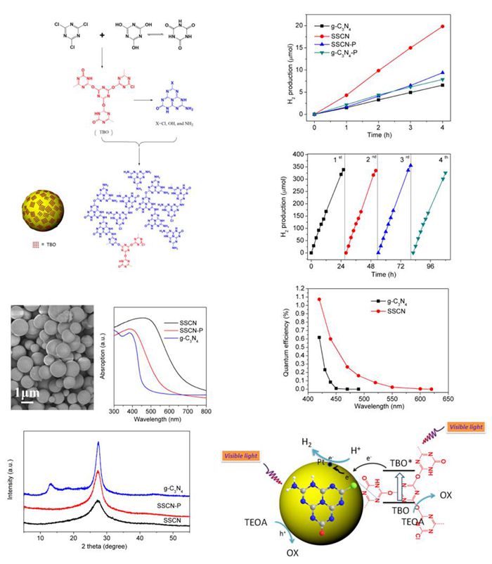 太阳能光催化制氢作为一个获得可持续能源最有前途的策略而备受关注。所有类型的光催化剂中,无金属半导体如石墨相氮化碳(g-C3N4)及其衍生物由于具有合适的能带结构和低成本引起能源、材料和化学工作者强烈的兴趣。但是g-C3N4仍然存在太阳能利用率低、量子效率低、制备耗能大和微观结构不可控,以及光催化稳定性等问题而限制了其在光催化方面的发展。针对这些问题,公司有机金属与电响应材料研究团队的顾泉副教授、高子伟教授与新加坡南洋理工大学材料科学和工程公司薛灿教授合作,实现了低温水热可控合成由含氧氮化碳核和共价交联的三嗪基染料表面组成的自敏化型无金属催化剂。