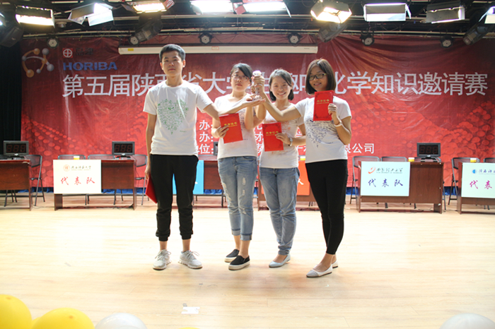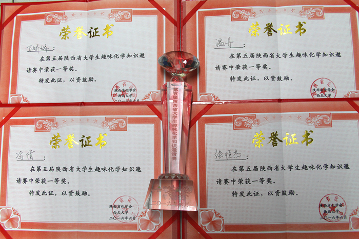 2016年6月16日晚,由陕西省化学会、西北大学主办,西北大学化学与材料科学公司承办的第五届陕西省老员工趣味化学知识邀请赛在西北大学长安校区隆重举行,公司2013级本科生张恒杰、温丹、万娇娇、冯倩四名同学代表公司参赛荣膺一等奖。