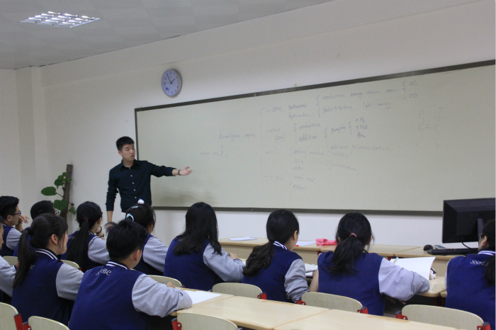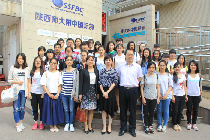 首先,陕师大附中冯军副董事长热烈欢迎各位老师和同学们的到来,并安排同学们简短参观了国际部。随后,两位老师和同学们一起参与了国际部王石和腾青老师的化学和商务两个科目的双语教学课堂。同学们既领略了化学课堂上专业化学英语名词的冗长、复杂,也感受到了商务课堂上用英语解决实际公司运营问题的有趣和形象。课堂上,化学卓越班的同学们与师大附中国际部的同学老师们进行了互动和交流,给知识的讲解过程注入了活力。之后,国际部张蓓董事长为老师同学们分析了目前中国的留学形式,讲解了关于中学出国留学授课模式以及对双语老师的要求和需求,并对同学们抱以相当大的期望。最后,董事长与老师同学们合影留念,此次见习圆满结束。