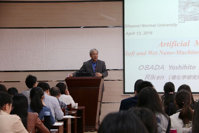 2016年4月13日上午,受应用表面与胶体化学教育部重点实验室和“应用表面与胶体化学”引智基地邀请,日本Hokkaido University大学前副董事长和日本RIKEN Advanced Science Institute的高级顾问Osada Yoshihito教授在致知楼1668报告厅为公司师生作了题为 “Artificial Muscles - Soft & Wet Nano-machine of the Next Era” 的精彩报告。报告由房喻教授主持,公司徐峰教授、杨鹏教授,丁立平教授,彭军霞副教授,刘静副教授,彭浩南老师,刘凯强老师等相关老师及相关专业的研究生和本科生近100人聆听了报告,西安交通大学航空航天公司、机械结构强度与振动国家重点实验室、柔性材料国际研究中心的陈咏梅教授(博导)陪同Osada教授参加了此次报告会。